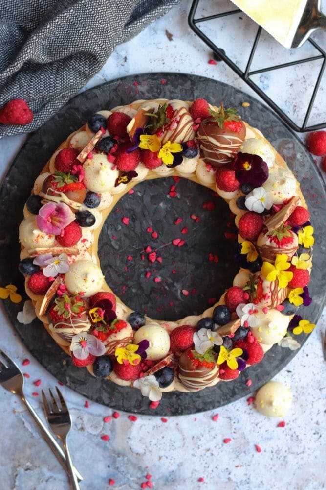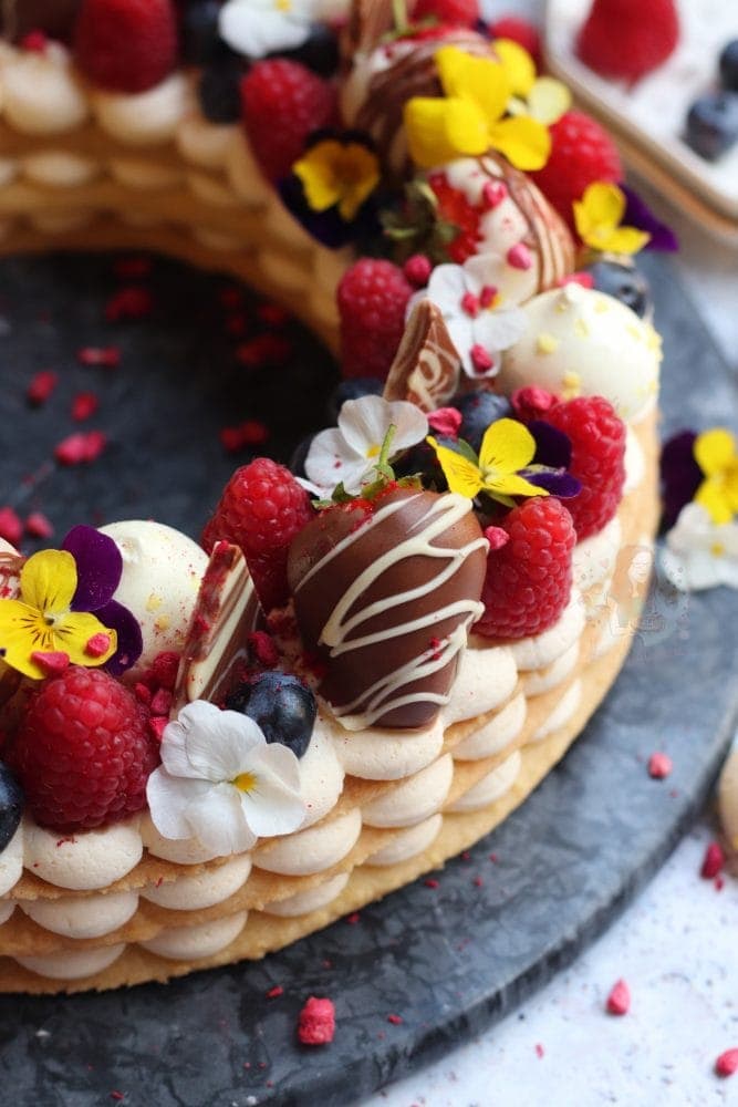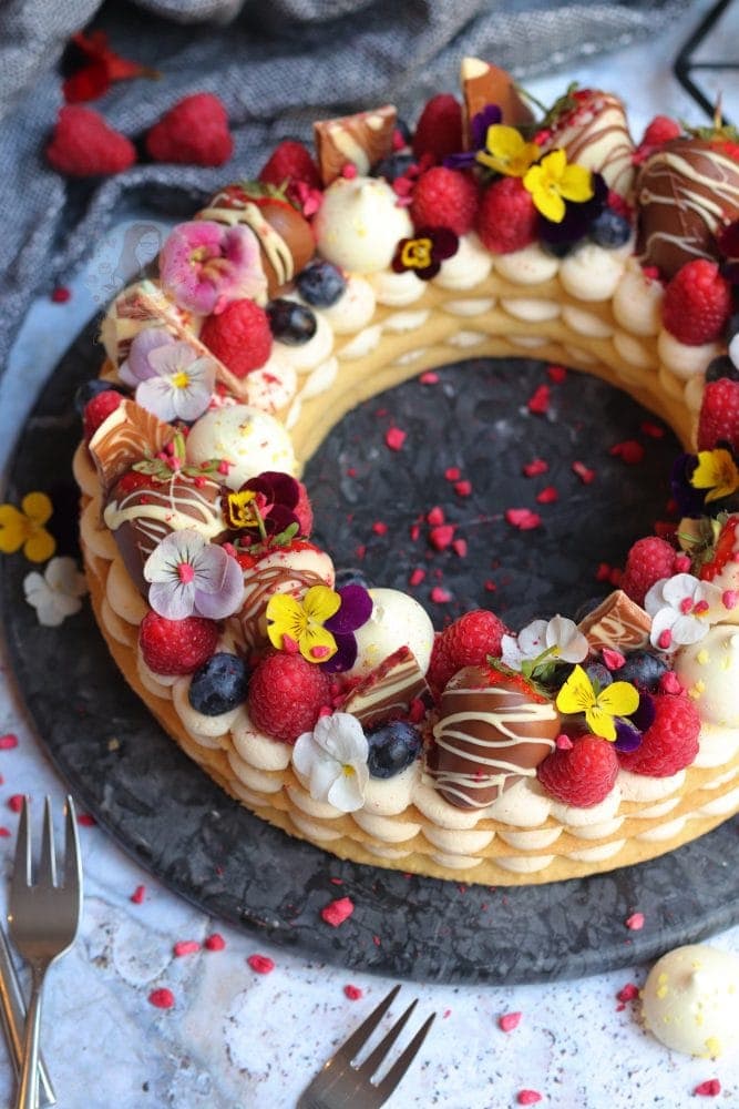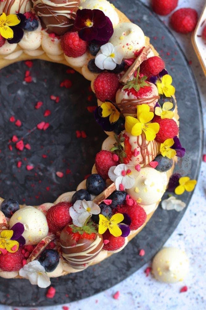I then use anything I have in my fridge, or anything I fancy for the topping. Chocolate coated strawberries, raspberries, blueberries, mini meringues, edible flowers, chocolate bark shards, freeze dried raspberries, and so on!