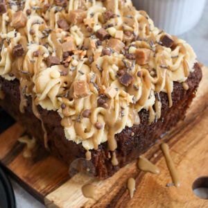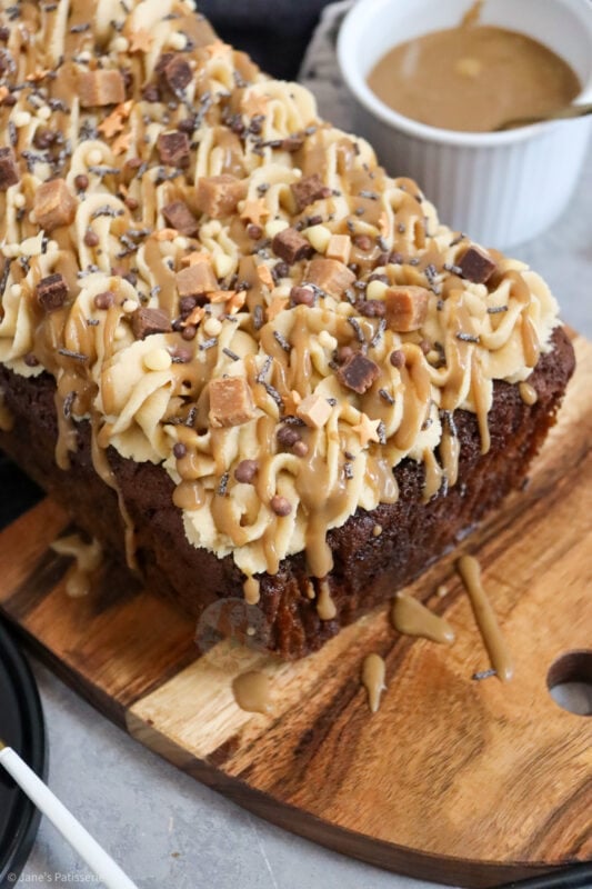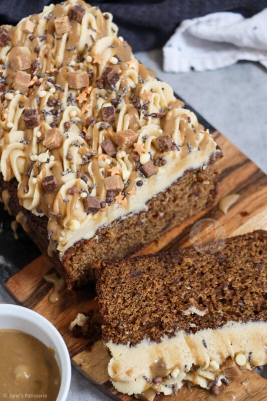 A sweet and delicious sticky toffee loaf cake with the sticky toffee sponge, sticky toffee buttercream frosting, and a sticky toffee sauce!