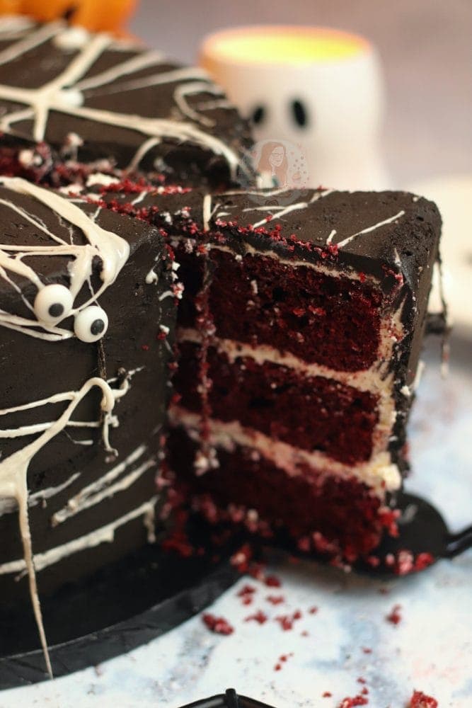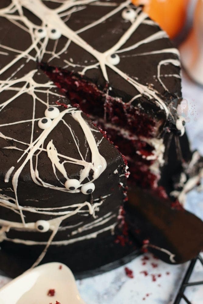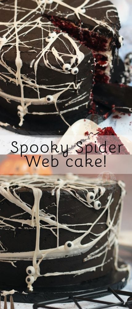 Spooky spider web cake with a red velvet sponge, white buttercream frosting, black chocolate buttercream frosting, and a marshmallow web… deliciously spooky.