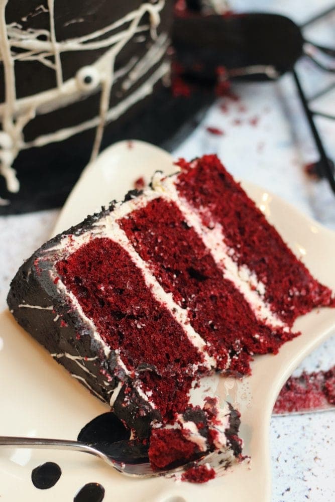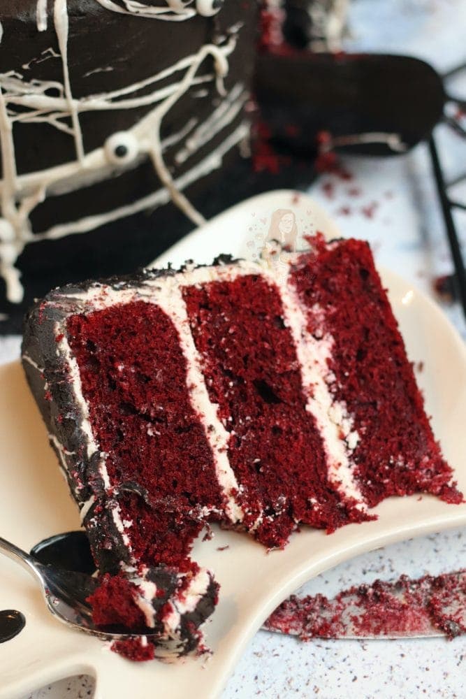 However… when it comes to cake? I feel like I should change this, and go all out. You guys also request spooky recipes, so I know it’s something you want! I wasn’t sure where to go, but after having a massive craving for red velvet the other day, I figured something red was the way to go.