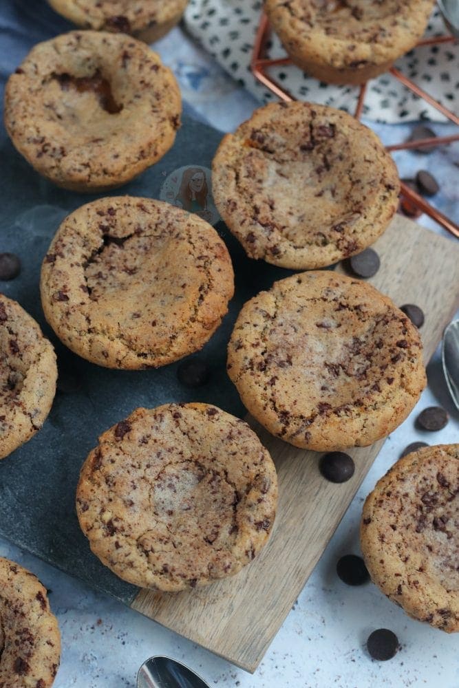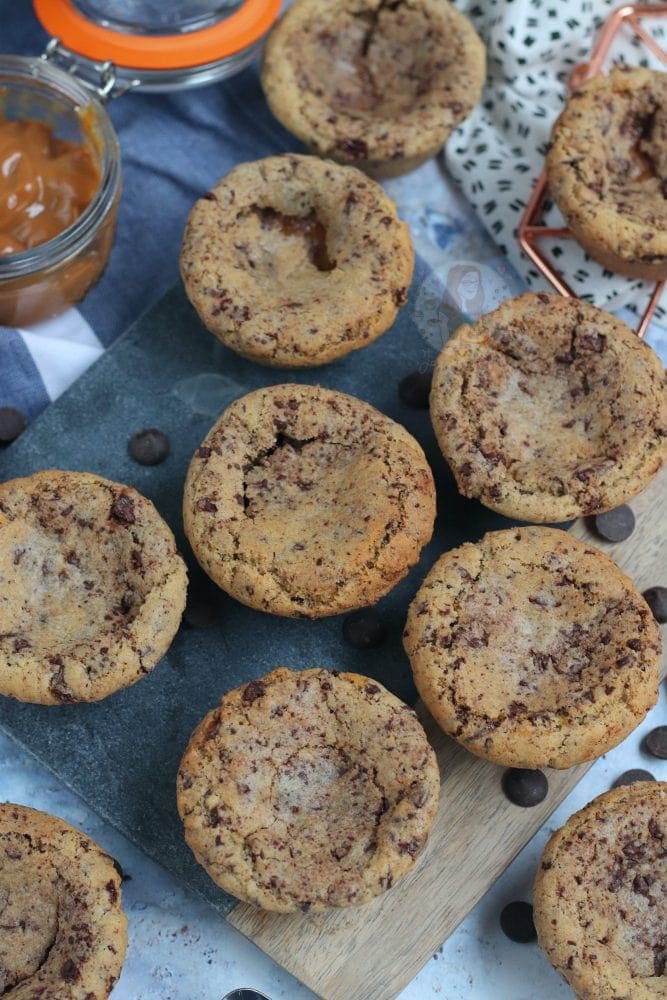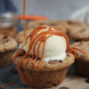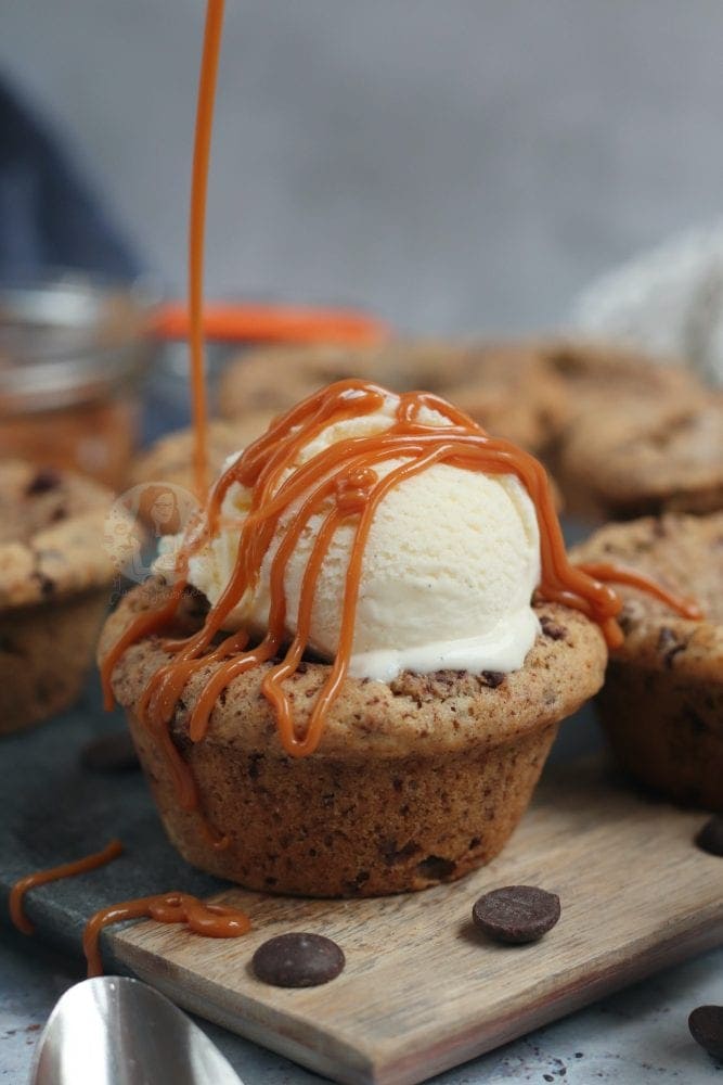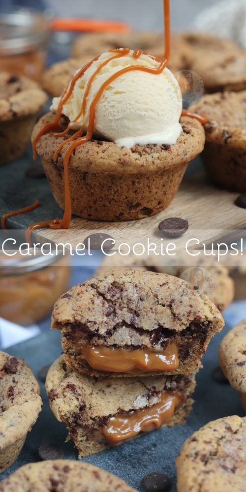 Sweet & delicious chocolate chip and caramel cookie cups! Perfect with a scoop of ice cream, and an extra caramel drizzle!