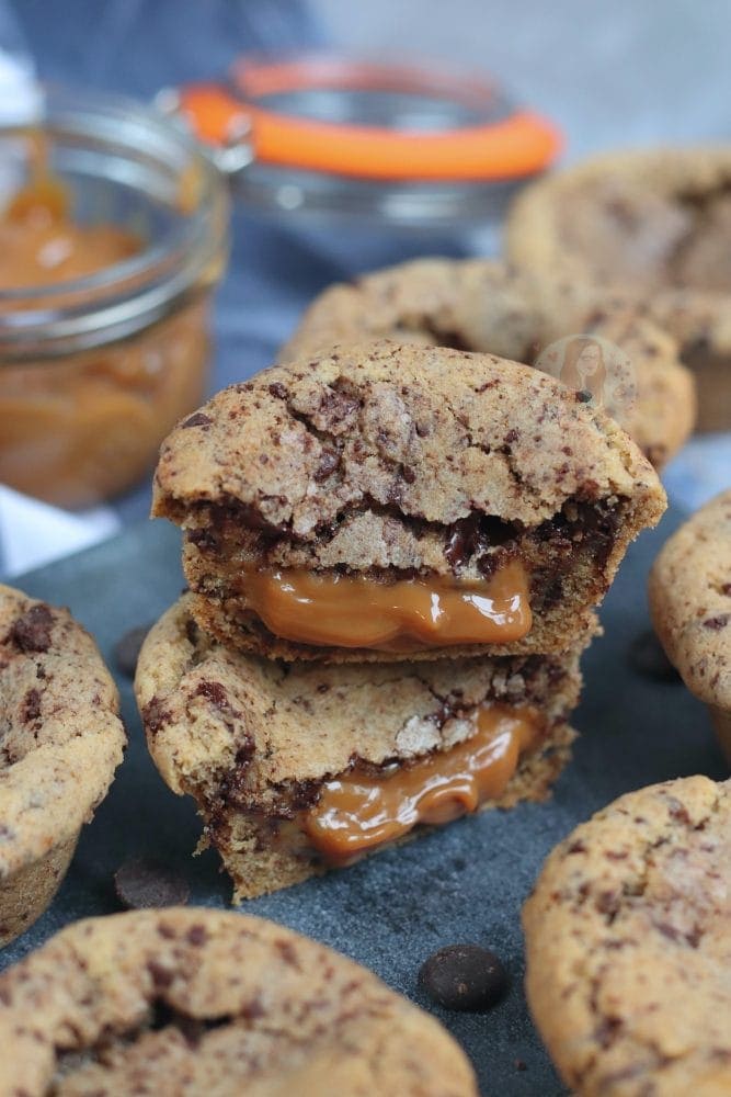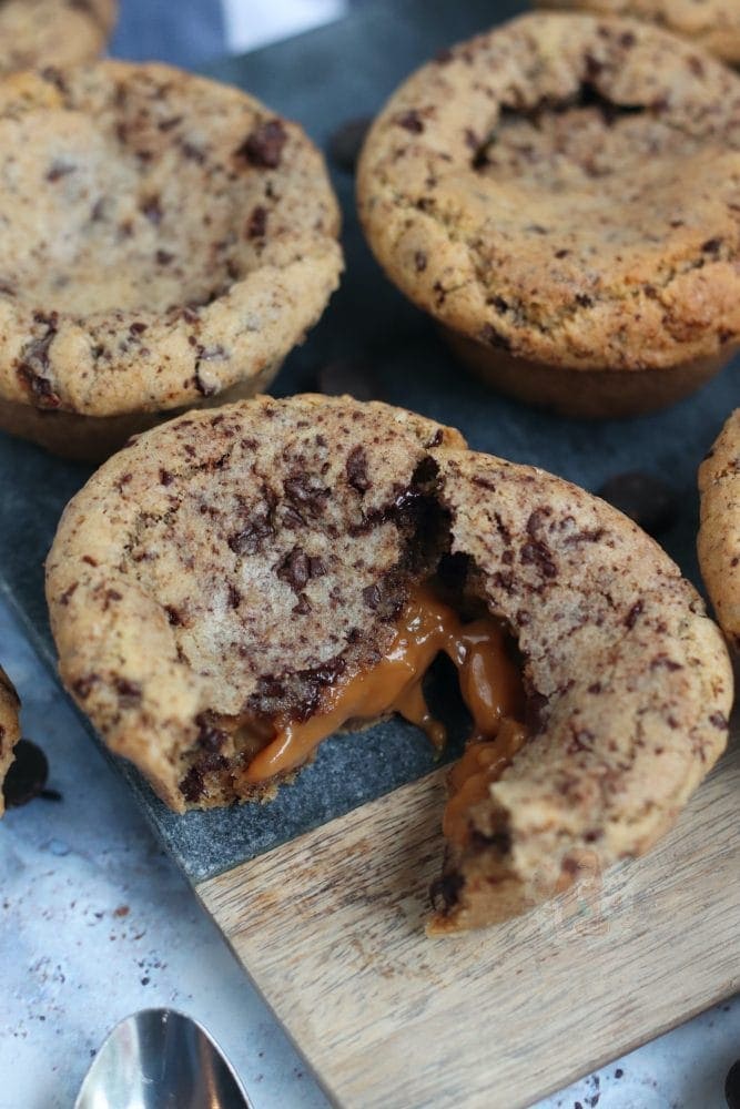 You just have to make sure when you are sealing all the cookie dough together, that you don’t leave any gaps for the caramel to seep out! If it gets out, you may get a sticky mess everywhereeee. It is easy enough once you get the hang of it though!