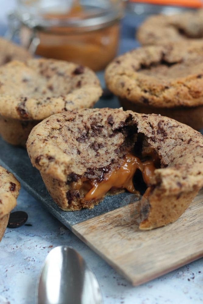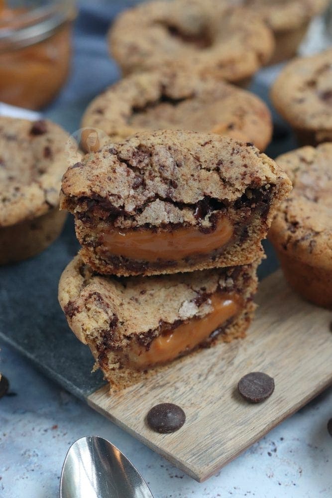 - Add in the caramel, I use a heaped teaspoon per cookie cup - don't over fill the hole with caramel though.