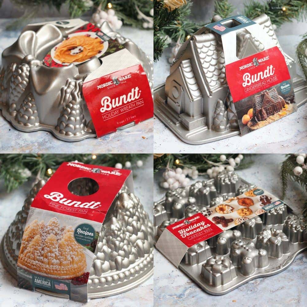 The four tins included in these photos are these ones – Holiday Wreath Pan, Gingerbread House Pan, Pine Forest Pan, and the Holiday Teacakes Cakelet Pan!