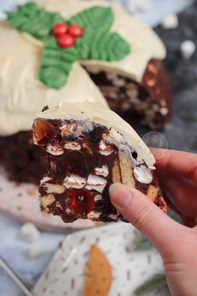 For the filling, it’s basically up to you. I used a mixture of digestives, amaretti biscuits, mini marshmallows, glacé cherries and some raisins. I get a lot of you don’t like raisins but you get the idea. Add in Maltesers, use just digestives, use just amaretti biscuits… so on. You can really customise this to be your ideal rocky road christmas pudding, and that’s the charm of it! It’s an easy and versatile bake.
