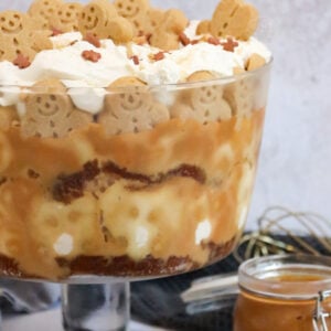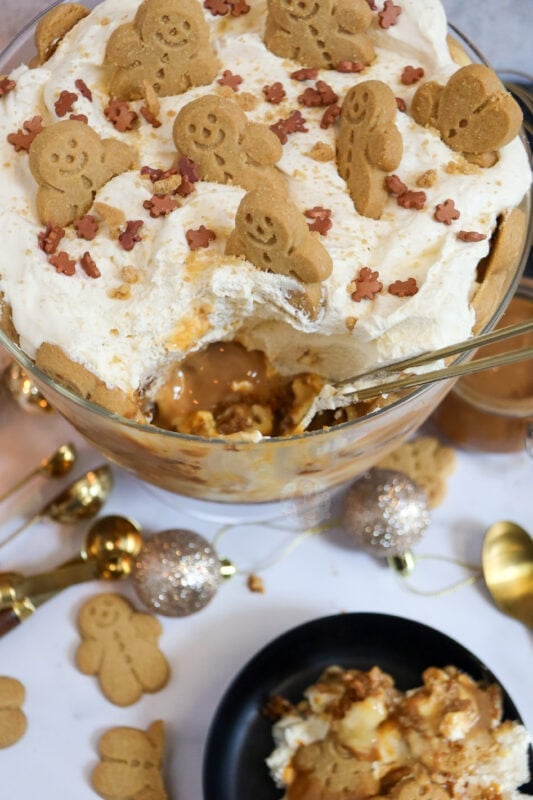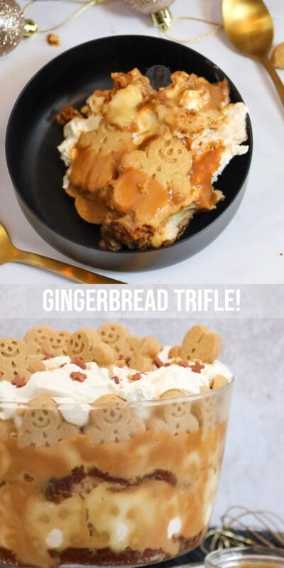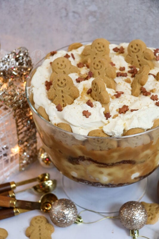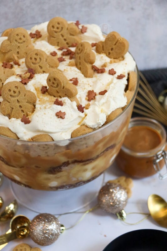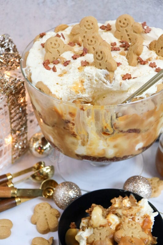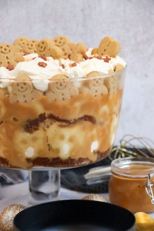 An easy gingerbread trifle with ginger cake, gingerbread, custard, ginger cream, caramel and more! Perfect no-bake dessert for the festive season!