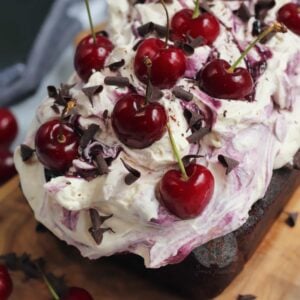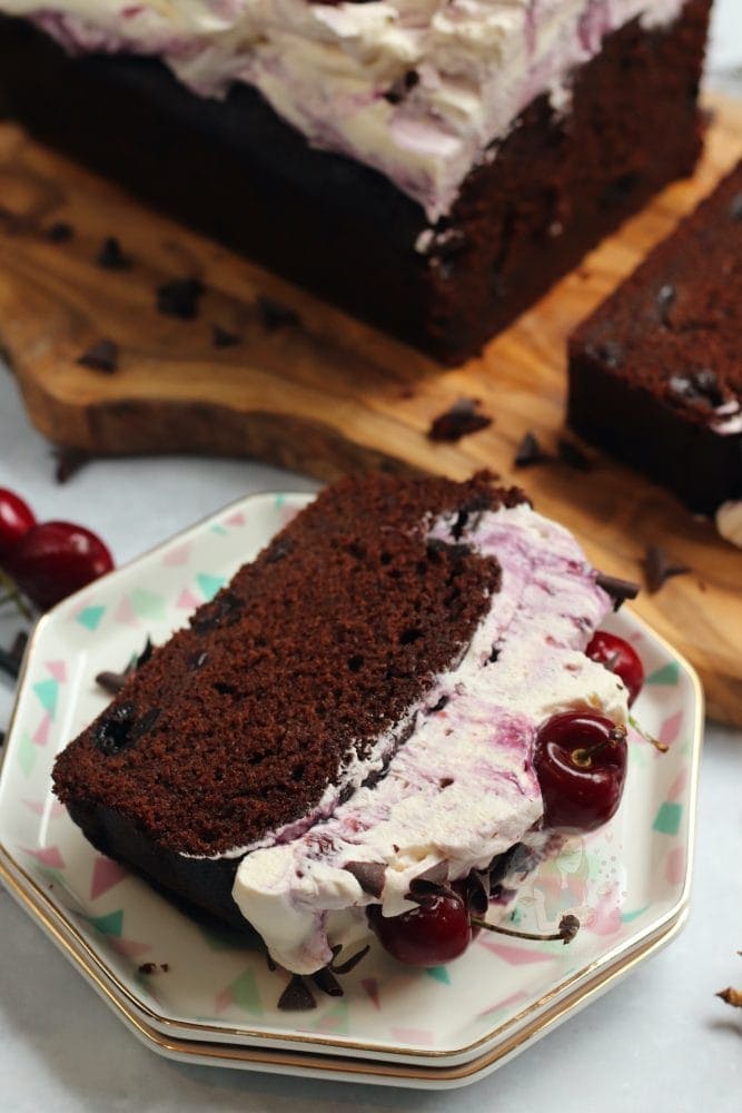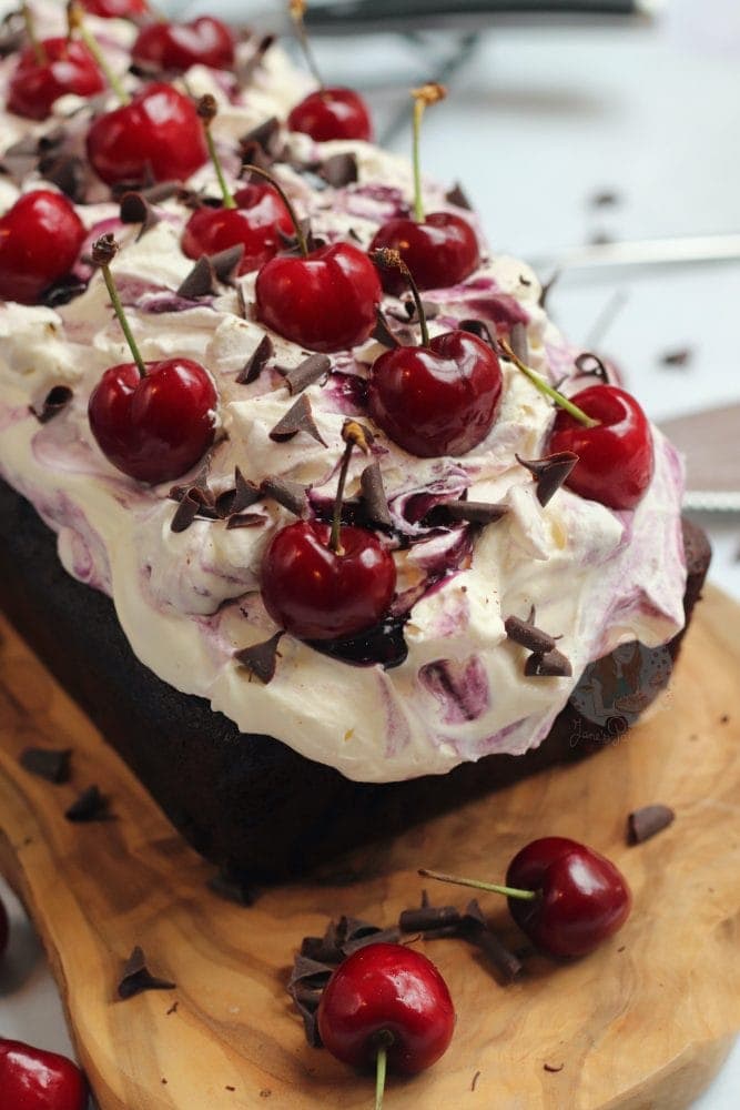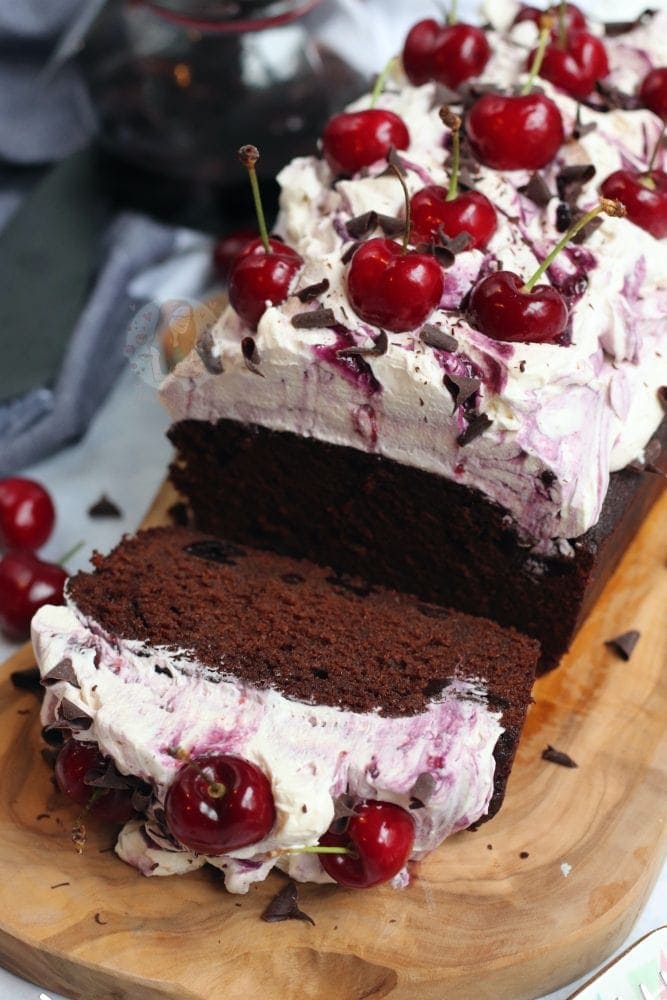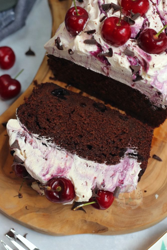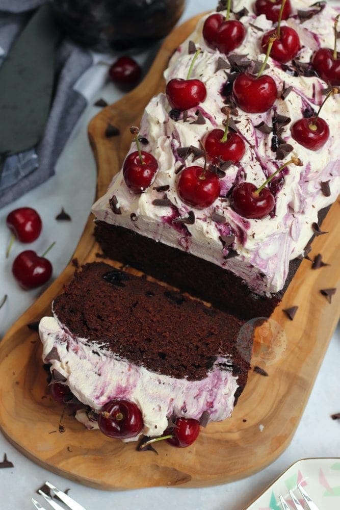 An easy black forest loaf cake with a chocolate cherry sponge soaked with kirsch, freshly whipped cream, cherries and more!