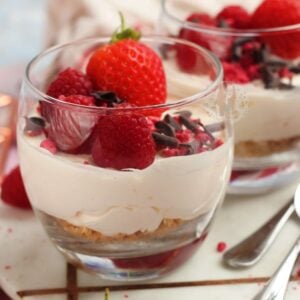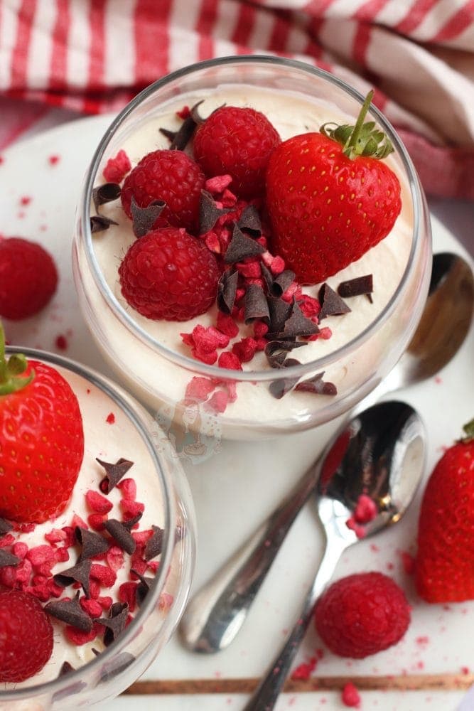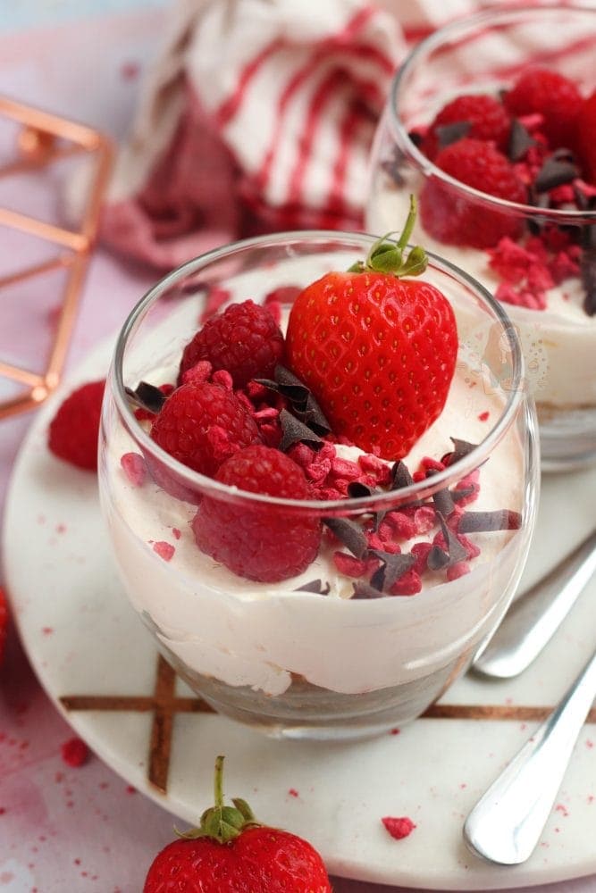 If you wanted to flavour this fruity, you could easily add in some lemon juice for example.. maybe 1-2tbsp of lemon juice, or 1/2tsp of lemon extract. You could fold through some fruit coulis, or chopped berries and so on. These will naturally loosen the filling slightly, but again, as they are served in glasses it’s okay.