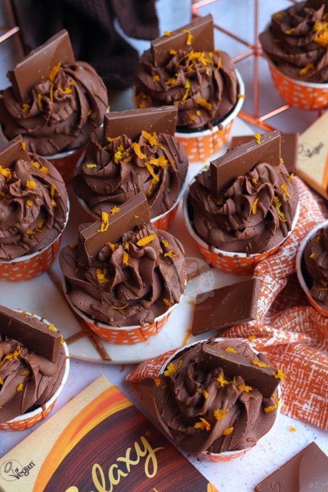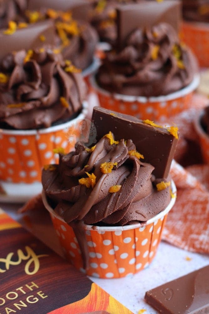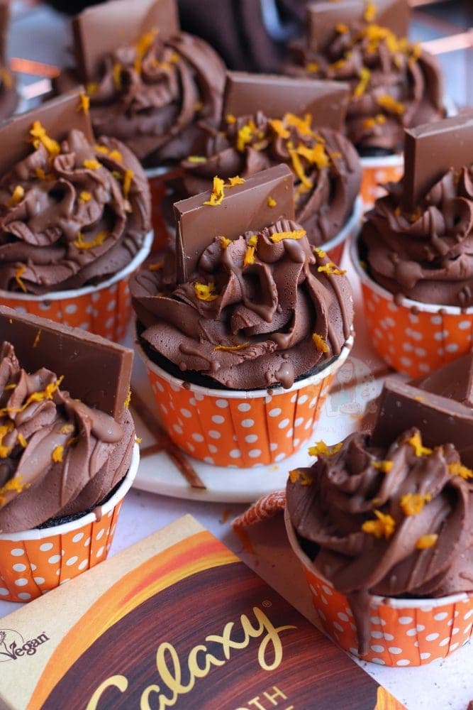 - I don't use the Galaxy chocolate orange in the frosting as it reacts different compared to normal chocolate and solidifies very quickly. I recommend just the drizzle if you fancy it, and the pieces on top!