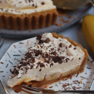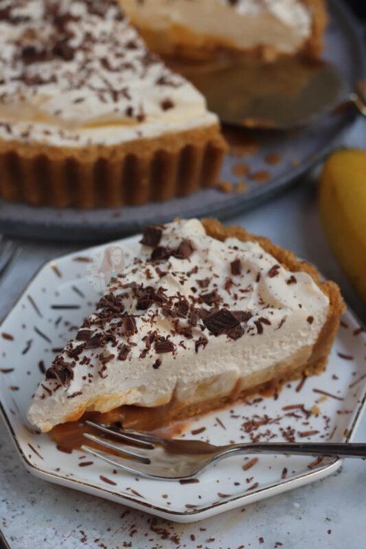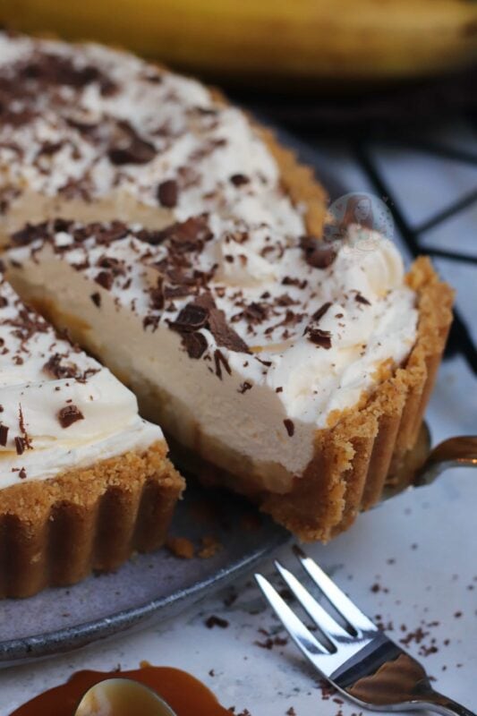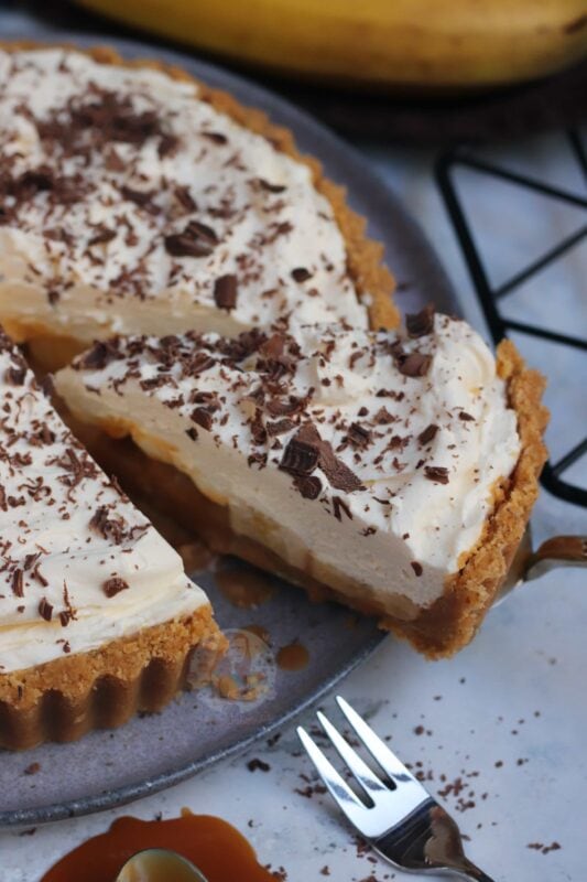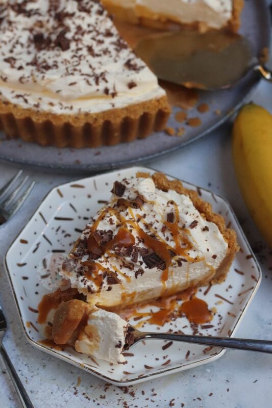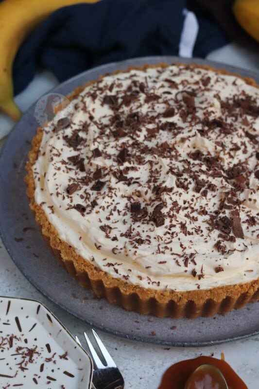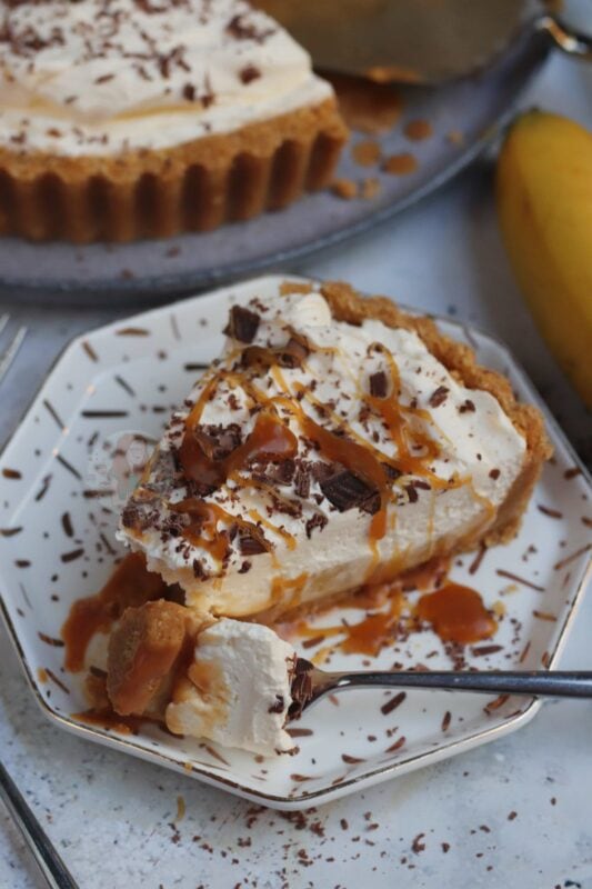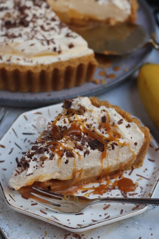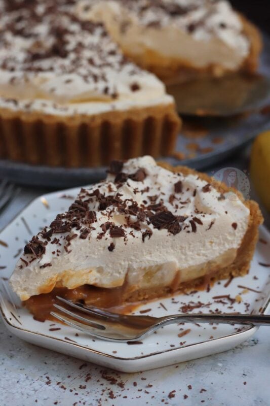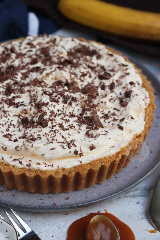 A delicious no-bake banoffee cheesecake with a biscuit crust, smooth caramel, fresh banana, vanilla cheesecake and cream topping!