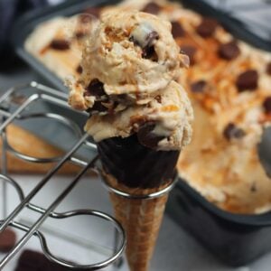 You can serve this in a waffle cone, a regular cone, in a bowl – with cream, with caramel sauce, with extra Rolos… there really is no end to it! You can even just leave the Rolos out and have a basic caramel ice cream! Let me know if you love the recipe or have tried it in the comments! Enjoy! x