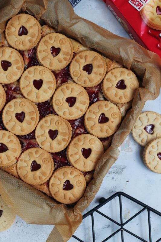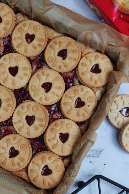 You can make your own homemade jammie dodgers – but I find the shopbought regular size ones PERFECTLY fit the 9×9″ square tin, and make it one jammie dodger per slice! You can use mini ones, or a mixture, or less! It would be hard to use more though… but you get me!