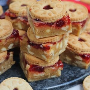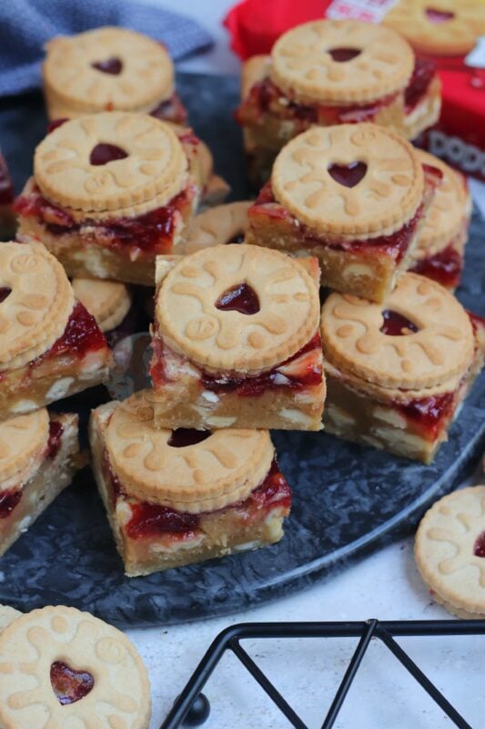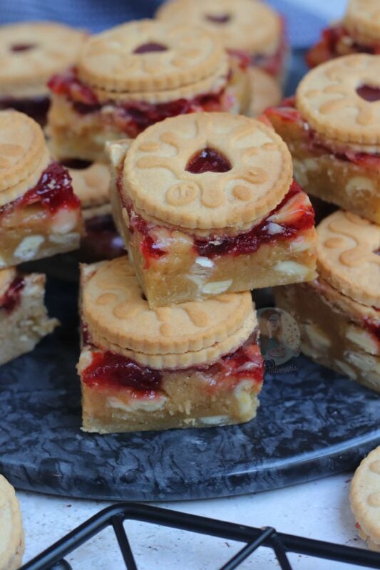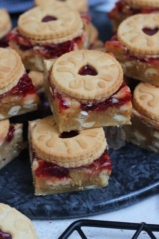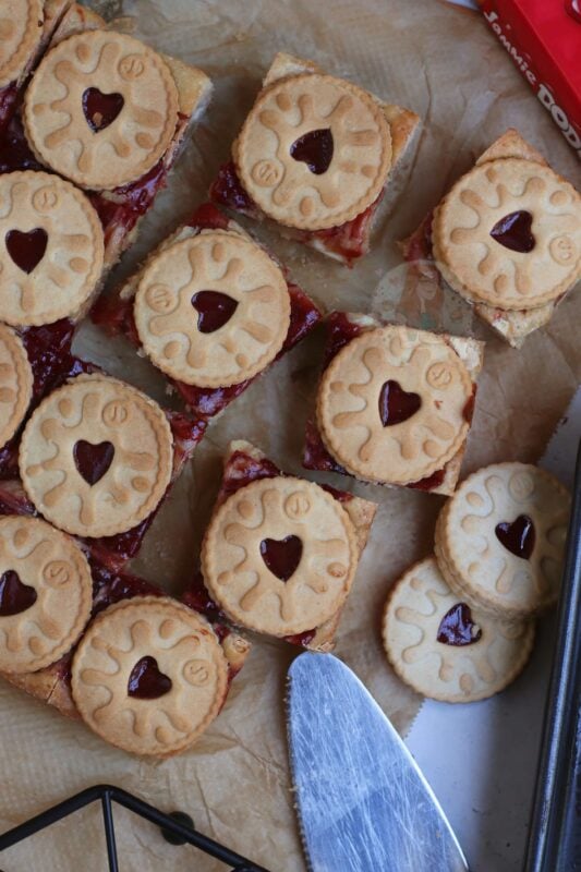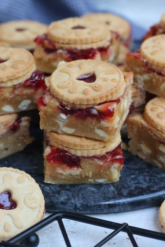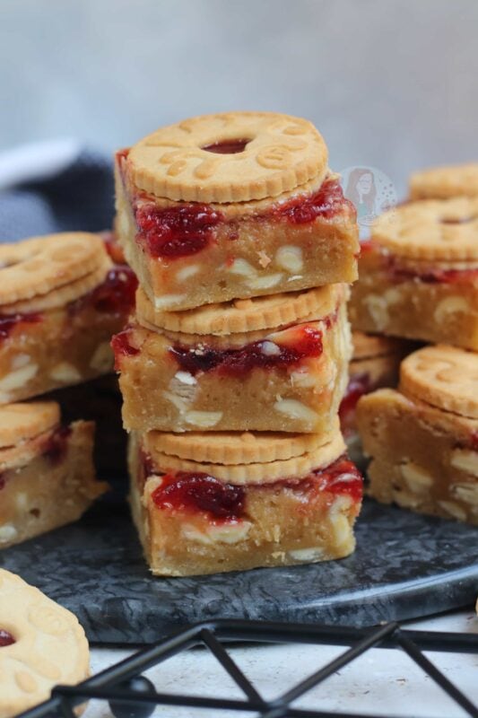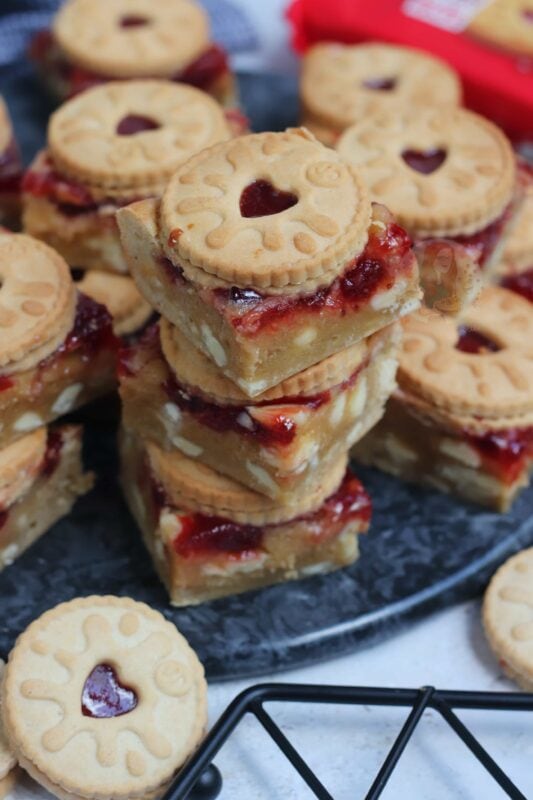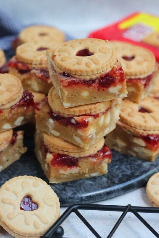 If your blondies still seem raw, you may have over mixed the mixture (just like brownies taking longer in some ovens!) – cover in foil, and bake in 5-minute increments. If you are unsure, once the jammie dodger blondies have cooled fully – you can ‘set’ them in the fridge for a few hours which will firm them up nicely, give the best texture, and make them easier to cut!