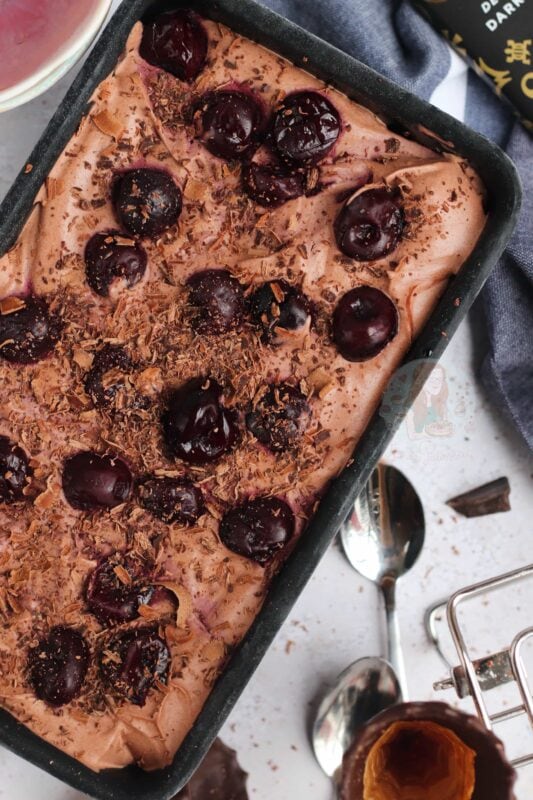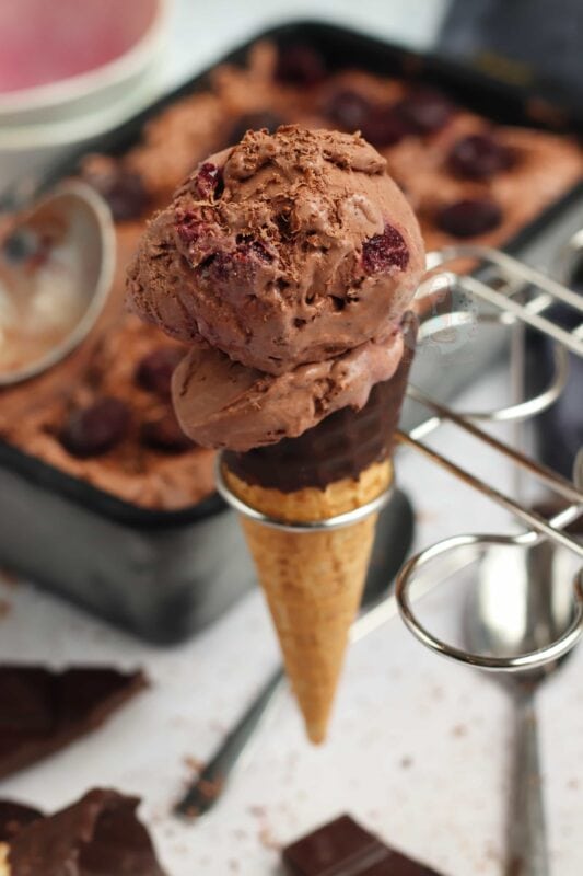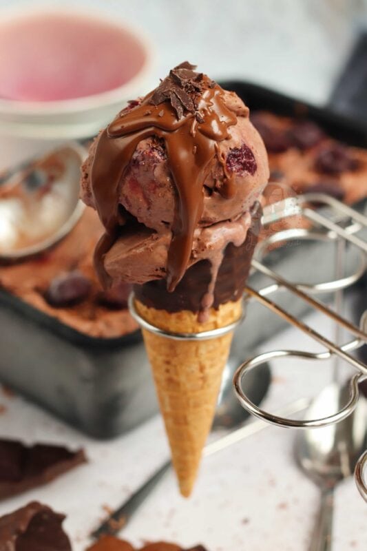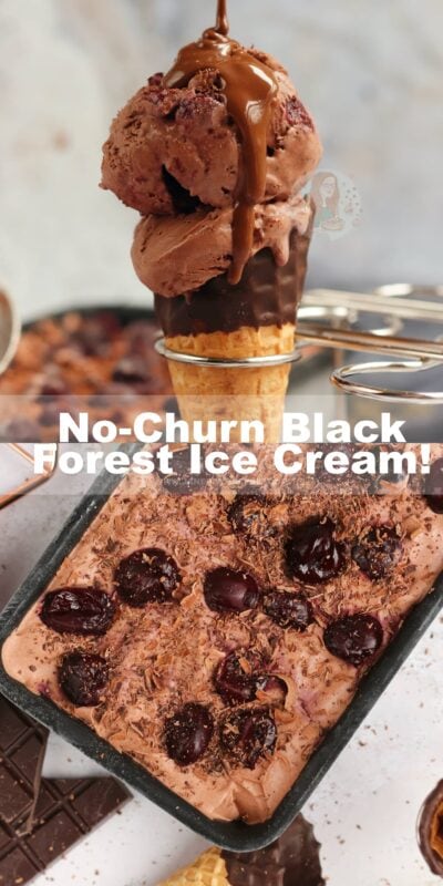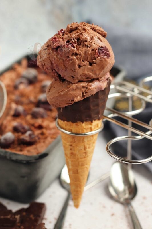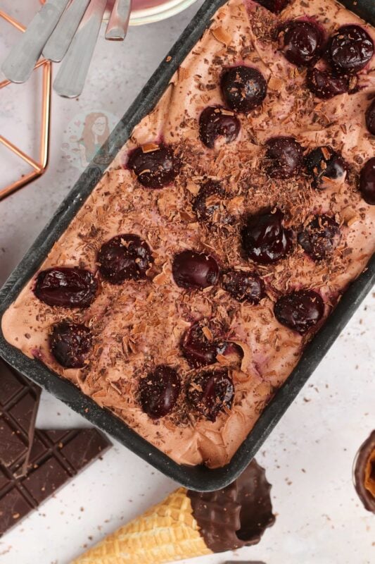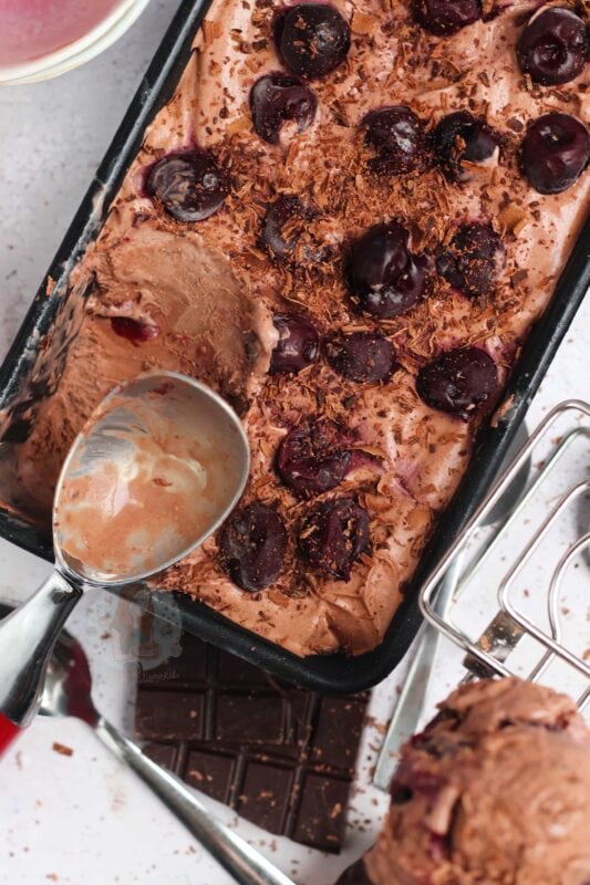 A delicious no-churn black forest ice cream with a chocolate ice cream, kirsch soaked cherries, and more!