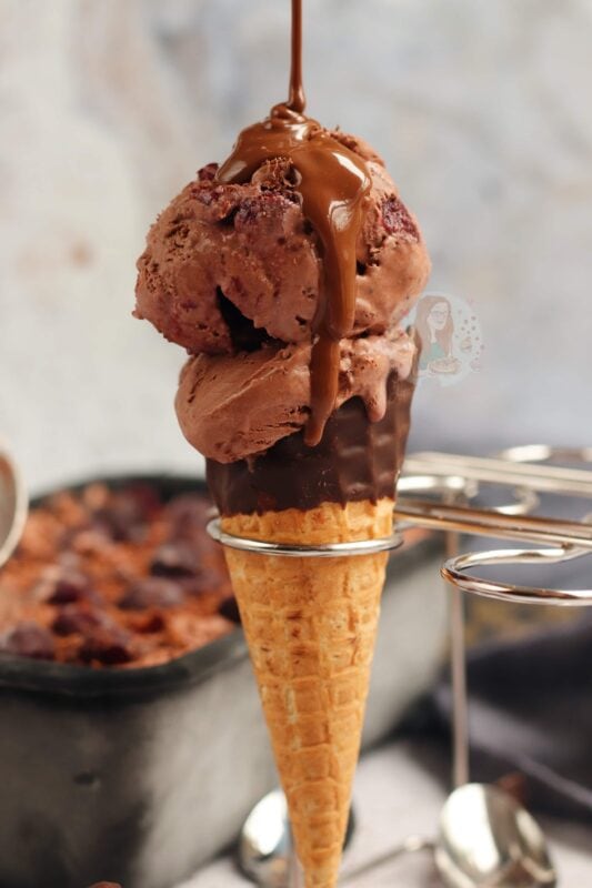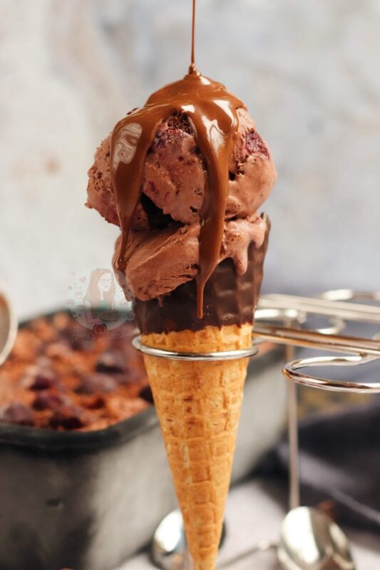 I served this in a chocolate topped waffle cone, with a drizzle of chocolate sauce… because you always need that bit more chocolate in my opinion.