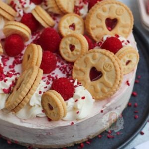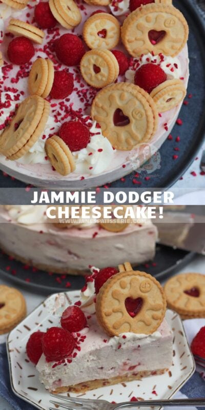 An easy no-bake Jammie Dodger cheesecake with a Jammie Dodger base, raspberry jam swirled cheesecake filling, and more Jammie Dodgers!
