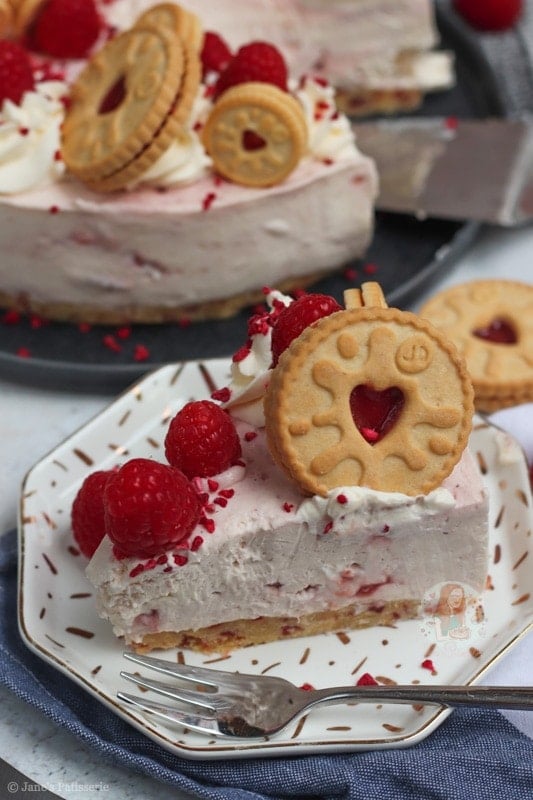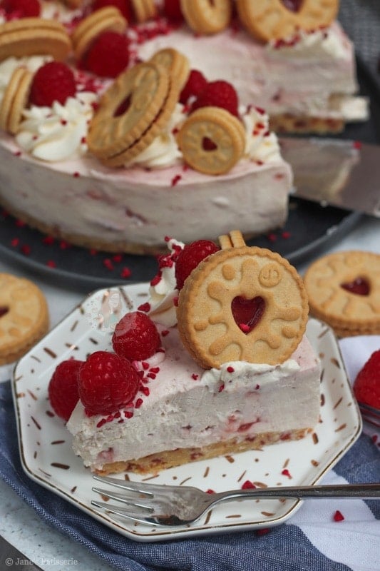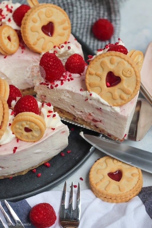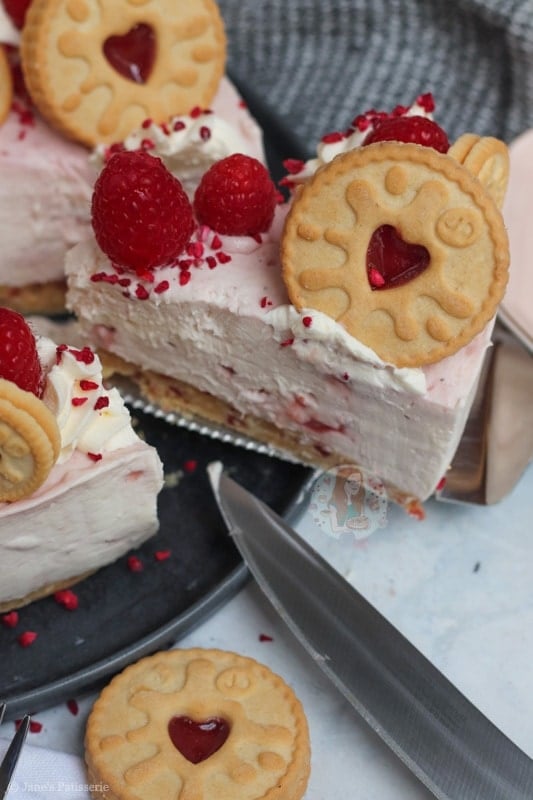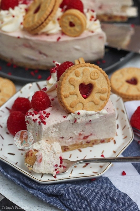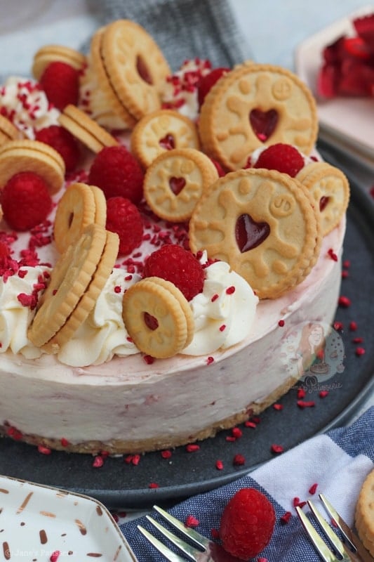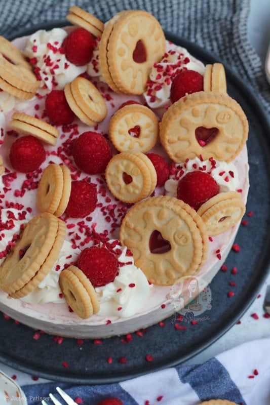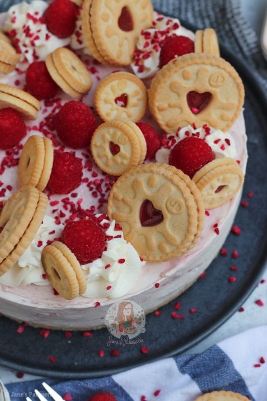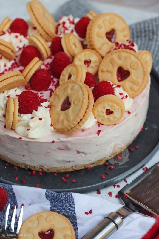 For the decoration of the cheesecake I did my usual sort of thing – piping whipped cream around the edges, raspberries, freeze dried raspberries and some more Jammie Dodgers. How could I possible resist adding in some more Jammie Dodgers?! The more the merrier.