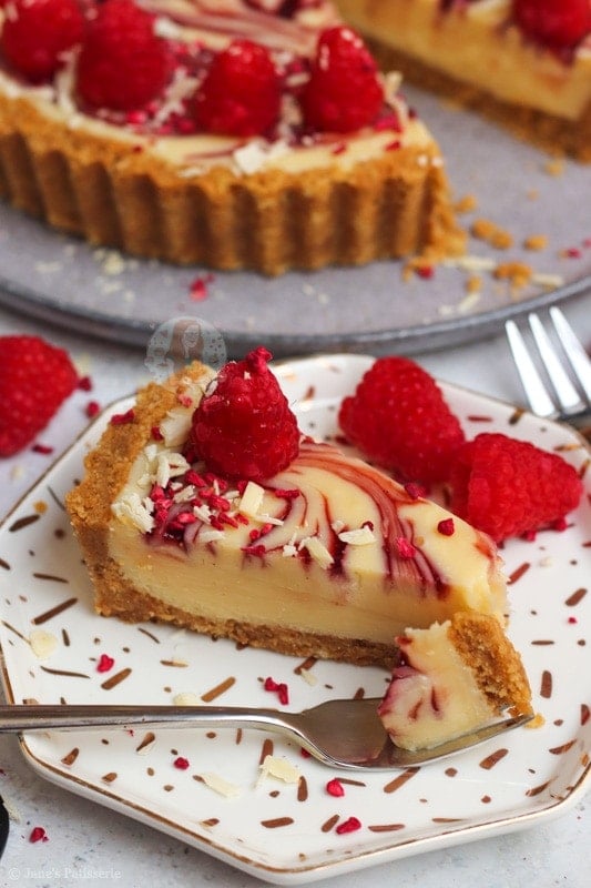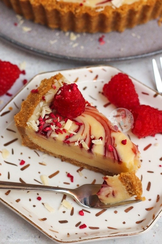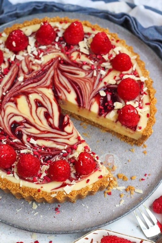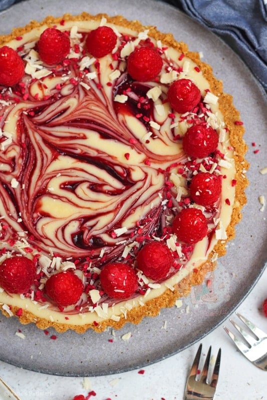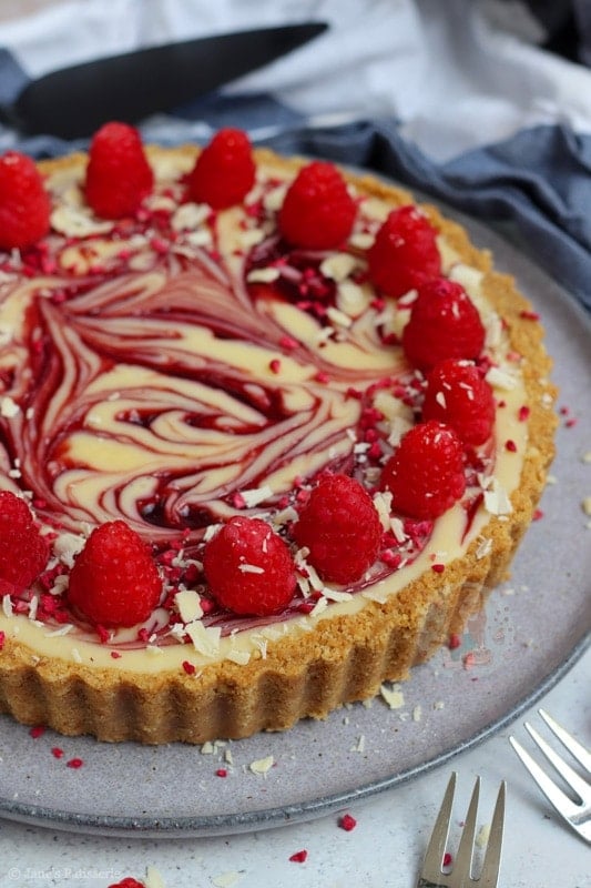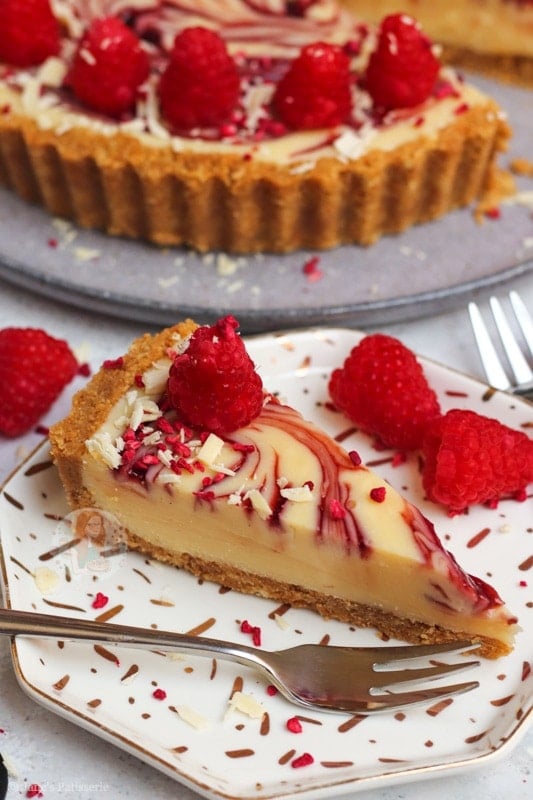 A delicious no-bake white chocolate raspberry tart with a biscuit base, white chocolate ganache filling, raspberry coulis and more!
