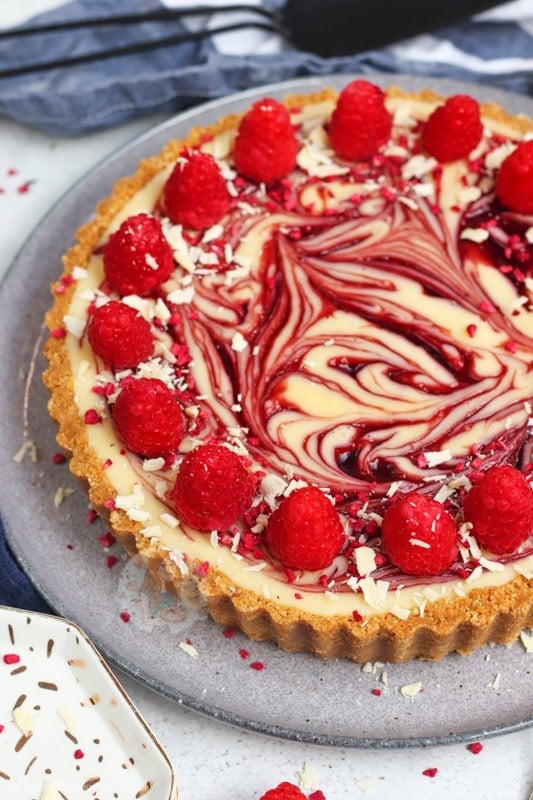 I use a loose bottomed tin so that it’s MUCH easier to remove! If you don’t, you’ll want to just serve the dessert from the dish you have used! You can’t really invert a tart like this, it might get messy!! Top the dessert with raspberries, freeze dried raspberries, and some grated white chocolate!