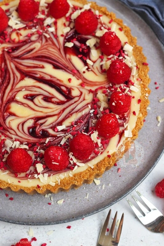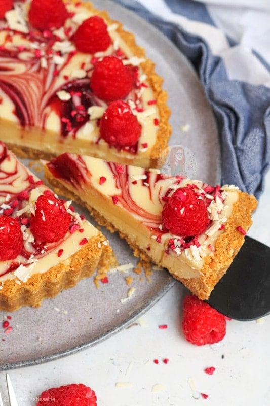 - Decorate the tart with some fresh raspberries and freeze dried raspberries, and some grated white chocolate!