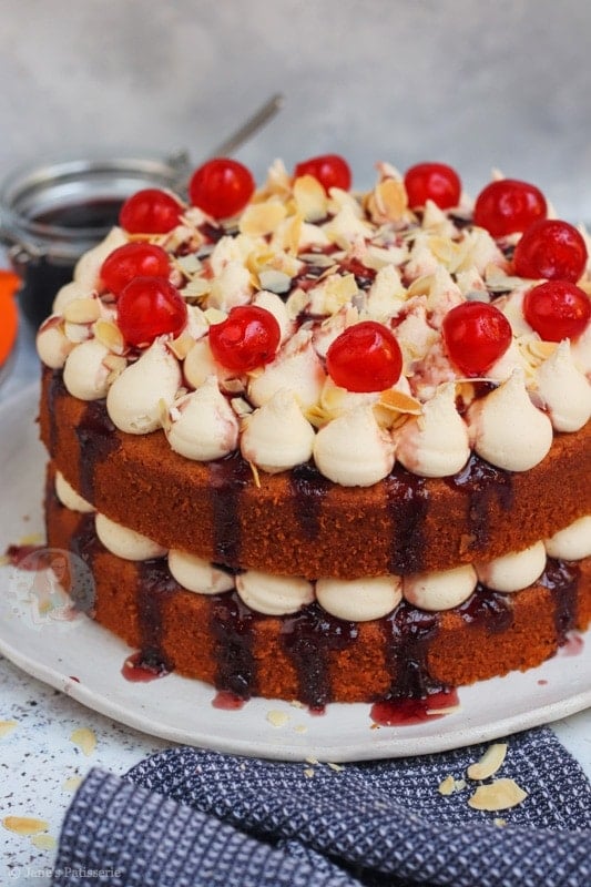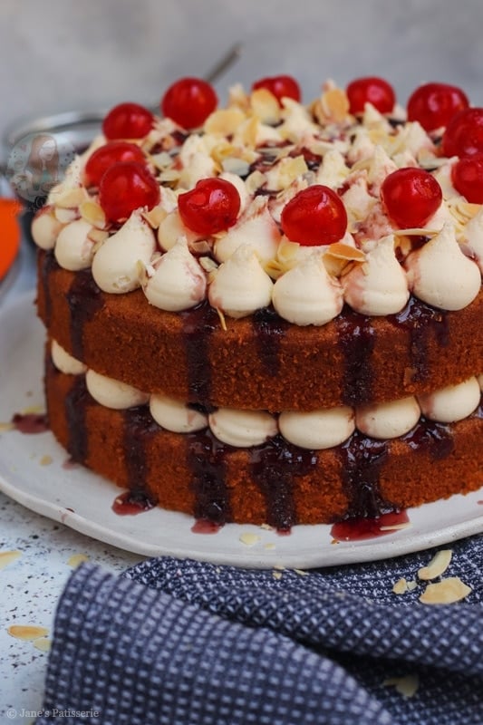 A two-layer bakewell cake with almond sponges, cherry jam, almond buttercream frosting and more!