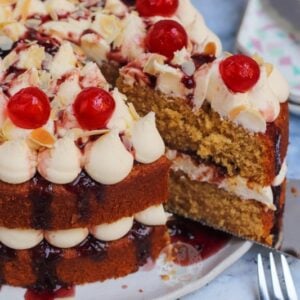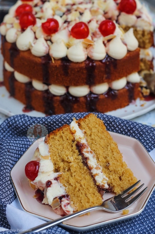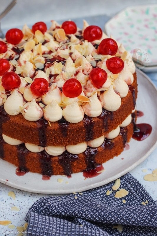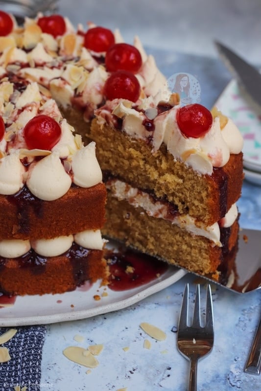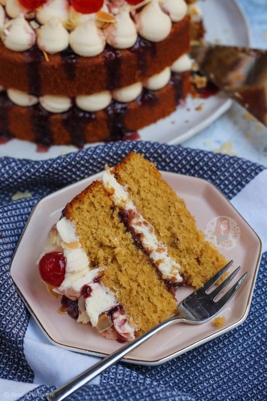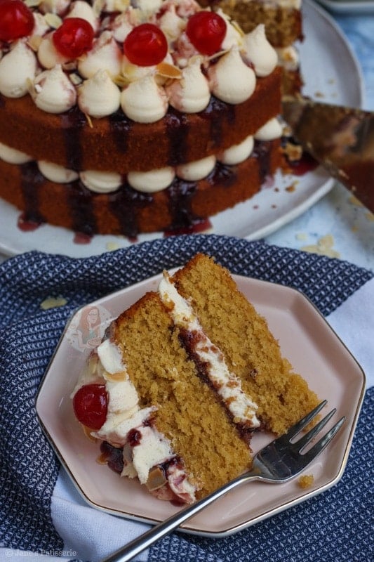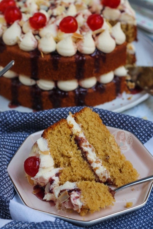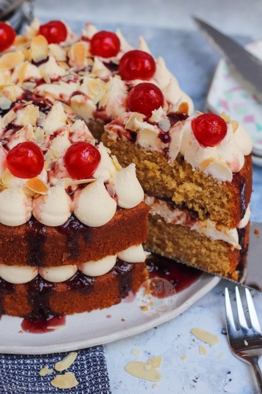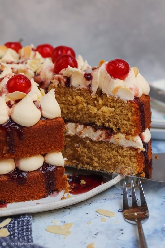 Because of the almond flavour being there, but in my opinion, not quite strong enough – I used almond extract in the buttercream frosting. This is completely optional, but I just loved it. Marrying that with the cherry jam or converse in the middle, it creates the best flavour ever.