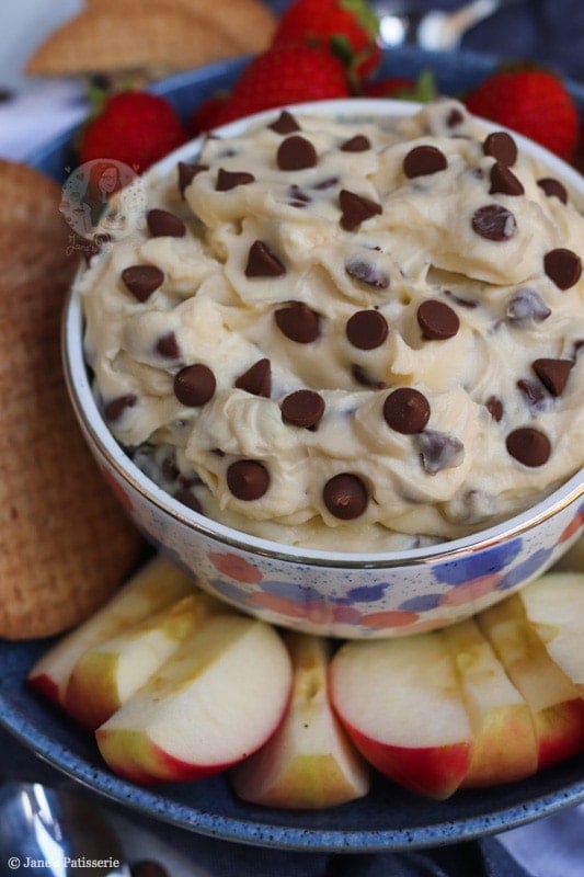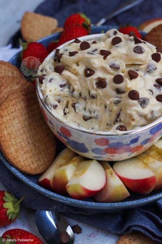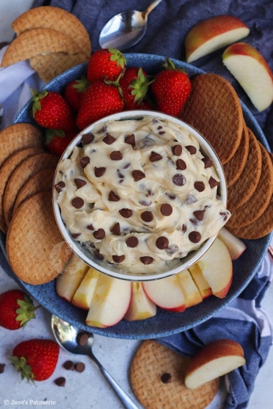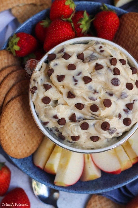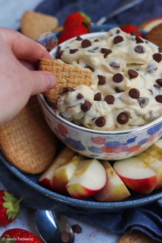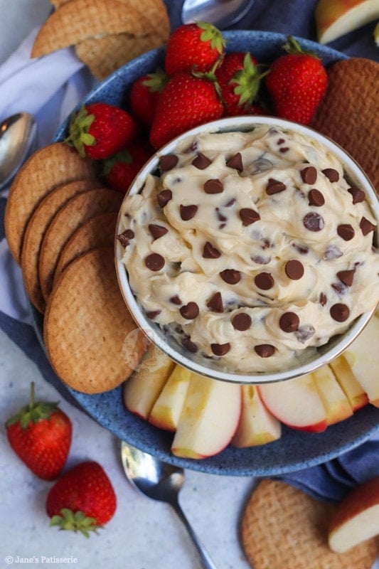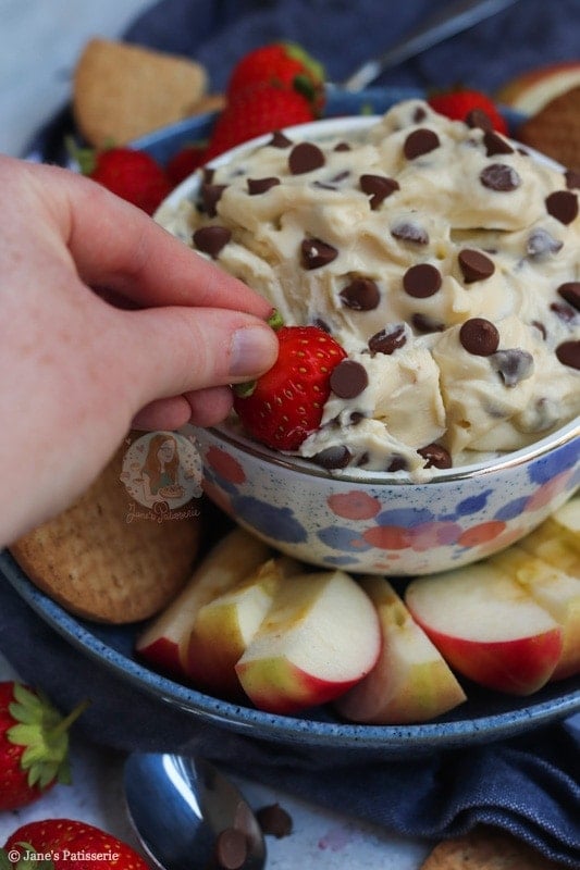 The reason this is called a cookie dough dip is that it really does taste like delicious cookie dough – and it is SO GOOD with almost anything. I had apple slices, strawberries and biscuits on the day I made this – but you can swap it up!