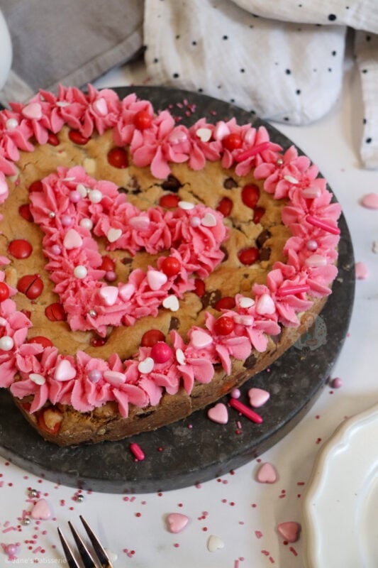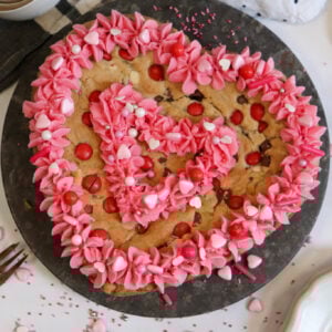 Giant chocolate chip Valentines cookie decorated with all things lovely and delicious… a giant Valentines cookie!