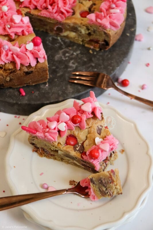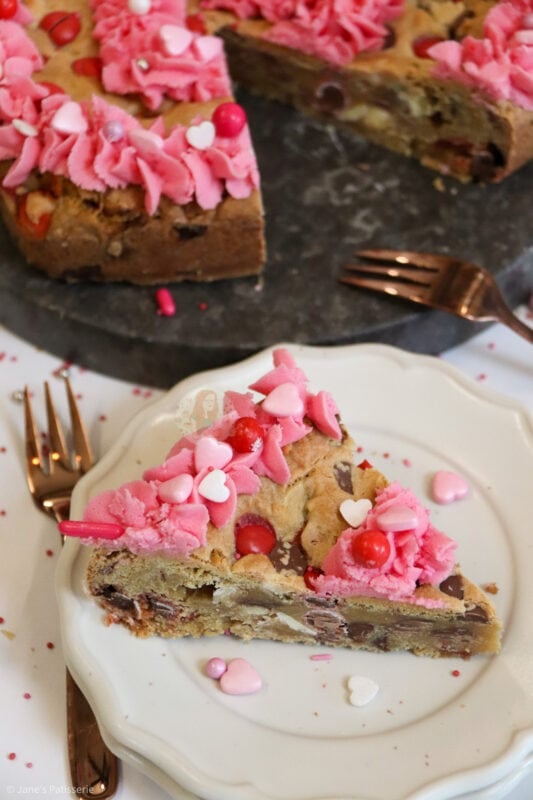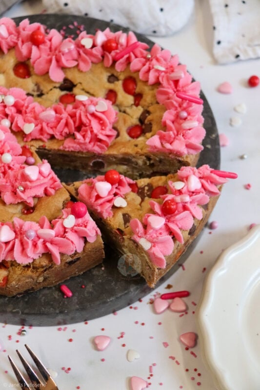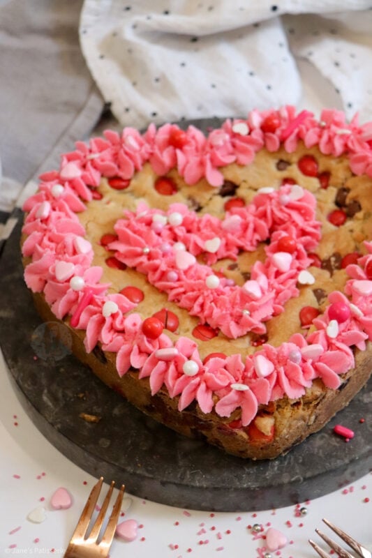 However, if you don’t have a heart shaped tin, you can use a round 8″ tin and bake a normal giant cookie, but still make it valentines themed with the pink and red colouring decoration that I have used.