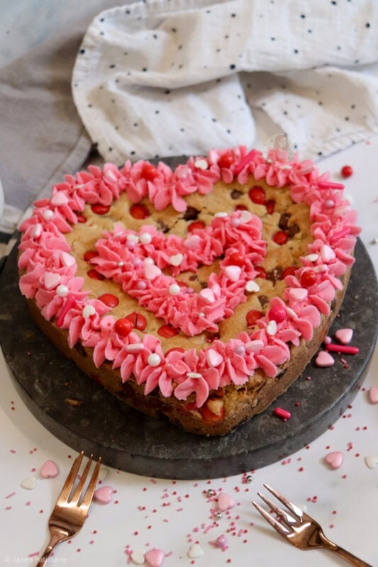 I made the giant Valentine cookie to share with my partner tomorrow. I had a slightly smaller tin, making the cookie deeper, so I cooked for an additional 10 minutes although I did cover the top with baking paper as I didn’t want the red chocolate beans to burn. I used dark chocolate and white chocolate chips in the cookie dough and then red M&Ms and pink and red smartie mini eggs to decorate the top. Once baked I piped the top with red buttercream and added some small sugar hearts and white Dr Oetker mini hearts. I also used red sprinkle sugar, free dried raspberries to decorate the top and spritzed with gold spray. I hope that it tastes as good as it looks.