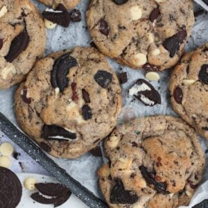 Giant chunky NYC style cookies stuffed with white, dark chocolate chips, and Oreo chunks! Oreo NYC cookies are heavenly!