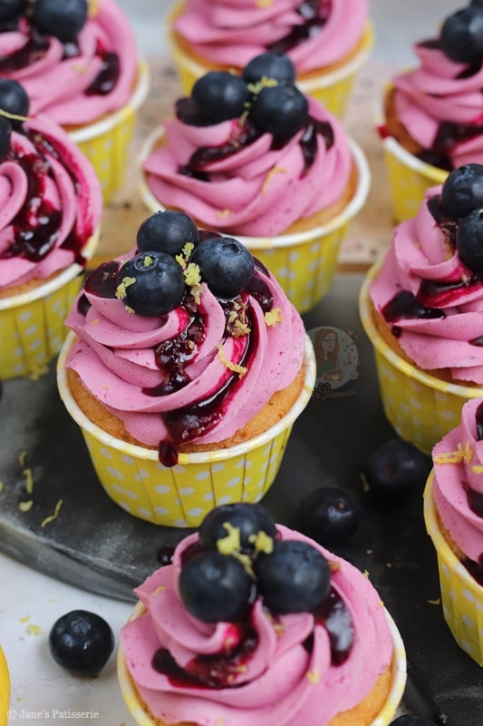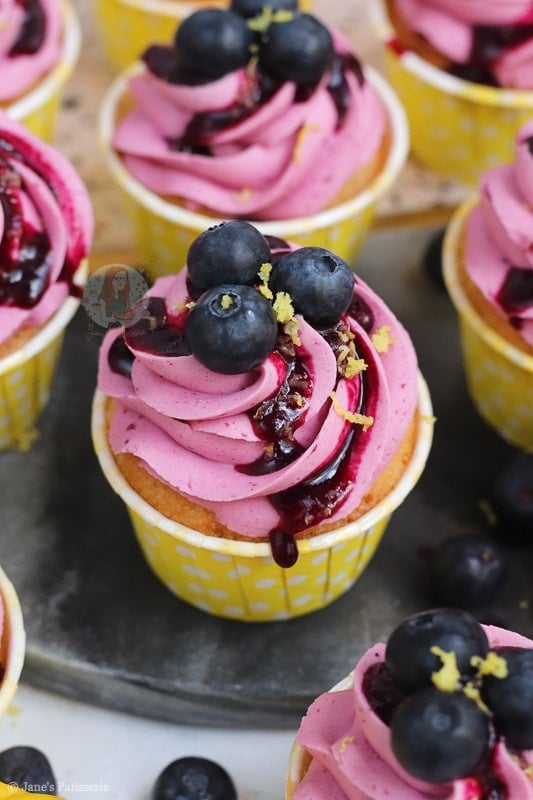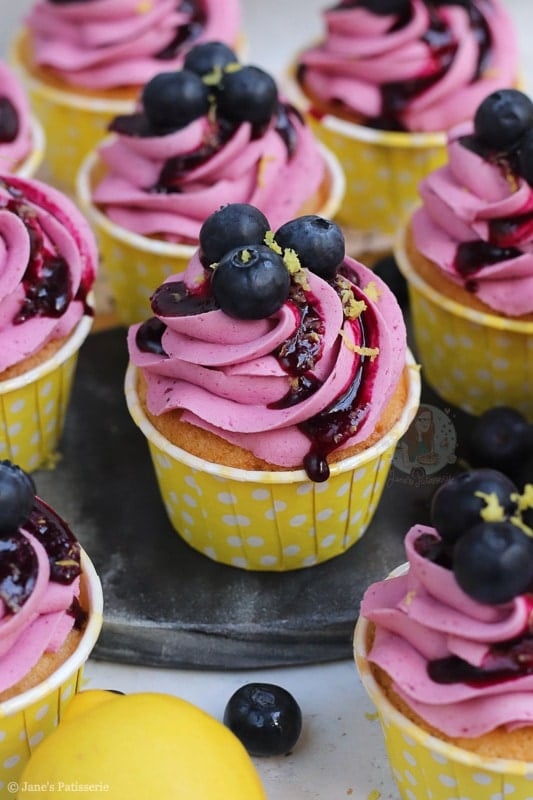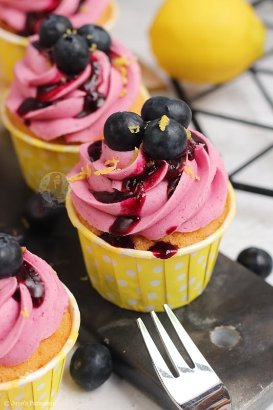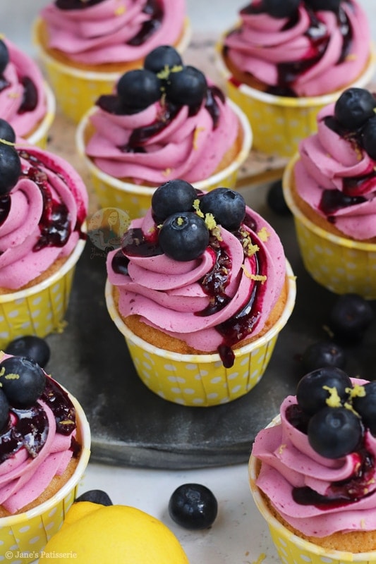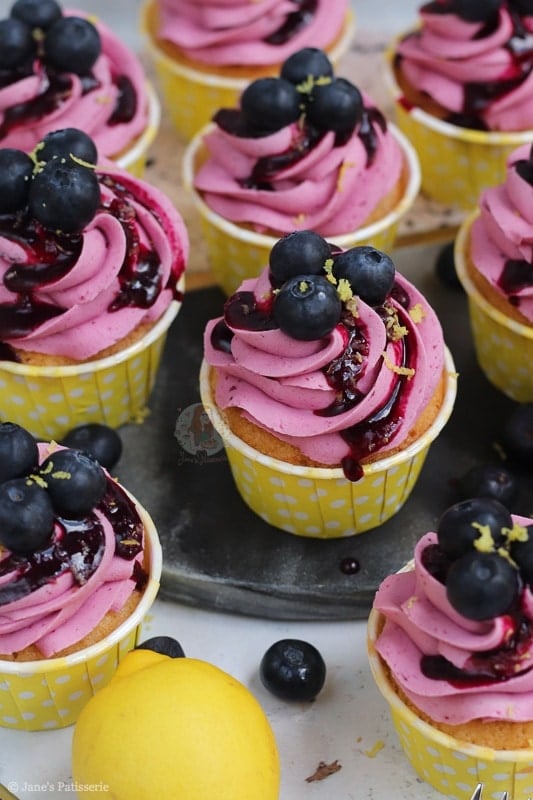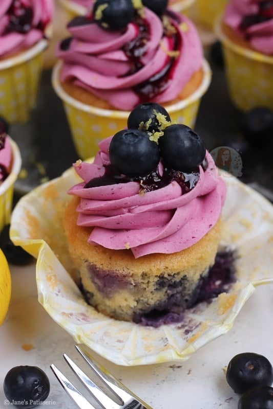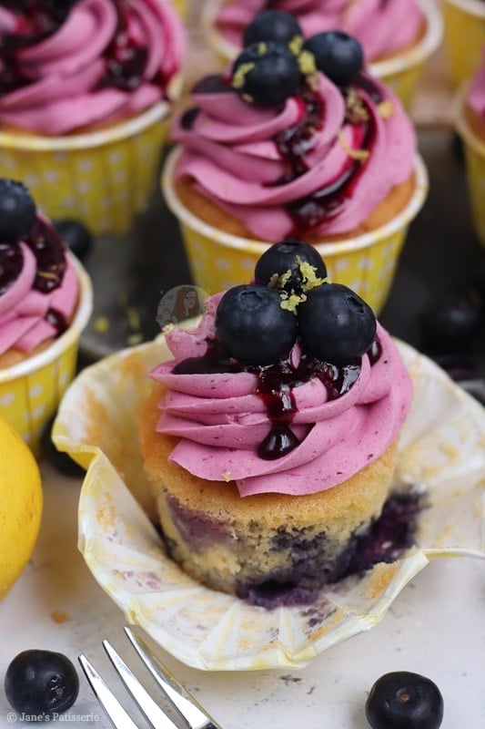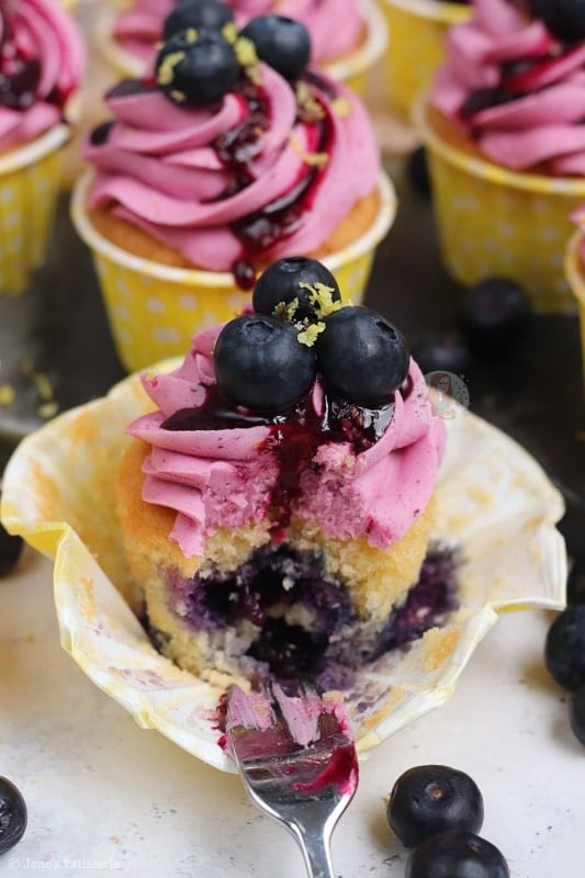 Deliciously sweet and moist lemon & blueberry cupcakes with a blueberry dotted lemon sponge, blueberry coulis buttercream and more!