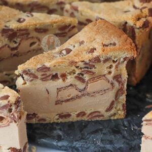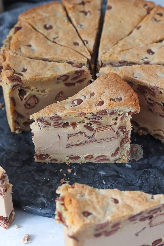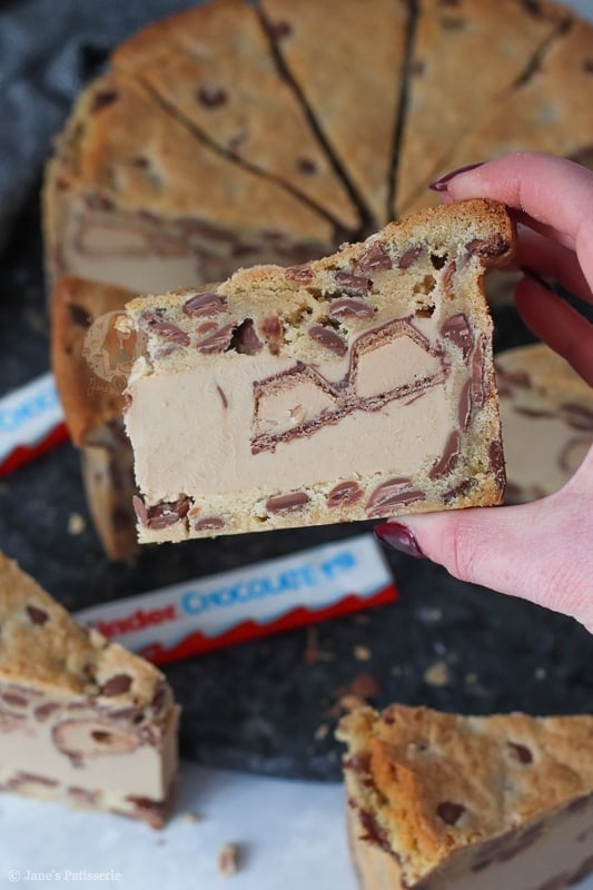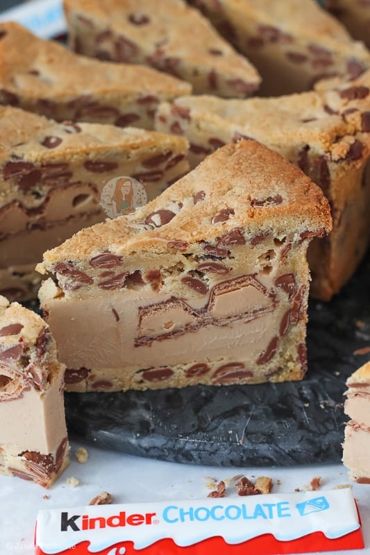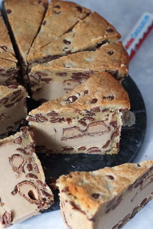 - Using a large and sharp knife, portion the Kinder Cookie Pie!