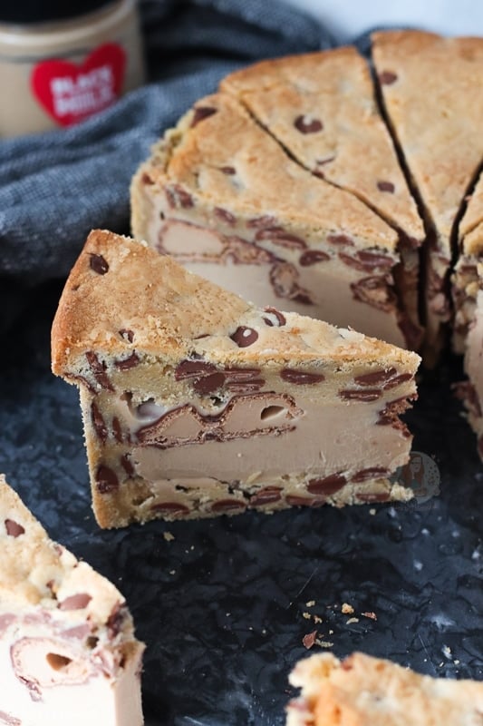 You want to chill the cookie pie so that the spread is firmed up and solid again before cutting! As I use the springform tin its easy to take it out, but you want it to be cold still. I then portion with a large sharp knife… and enjoy!