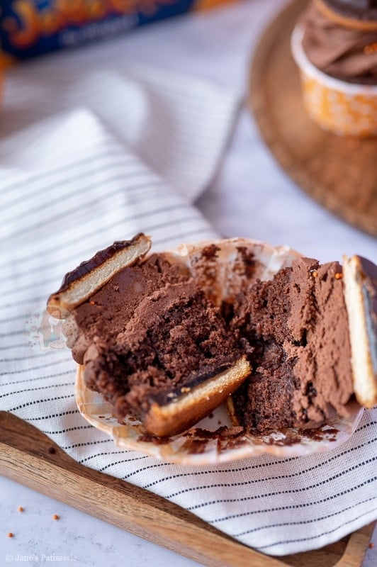 I wanted the Jaffa cake on the bottom of the cupcake so that there was a bit more to this bake – I didn’t fancy trying to involve jelly in this (although there is an option mentioned below where you can core out some of the cupcake and fill it with jam/marmalade instead!