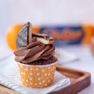 Scrumptious chocolate and orange Jaffa Cake cupcakes with a hidden Jaffa Cake, chocolate buttercream frosting and a Jaffa Cake on top!