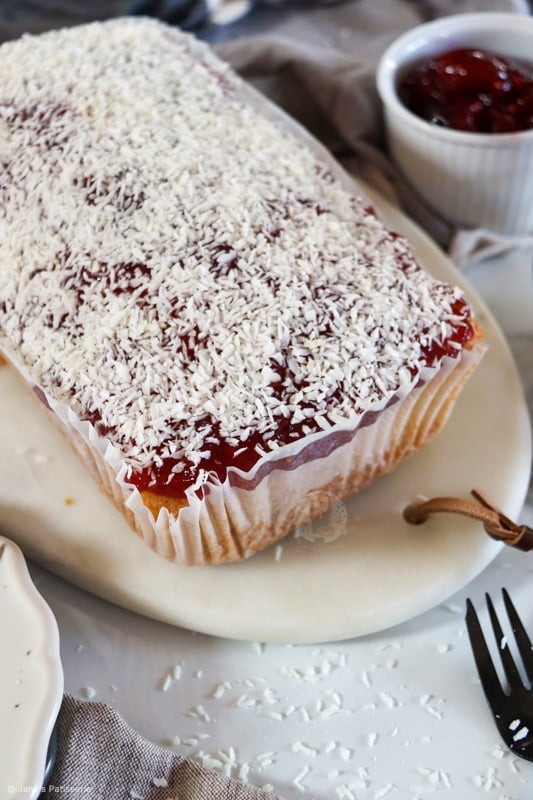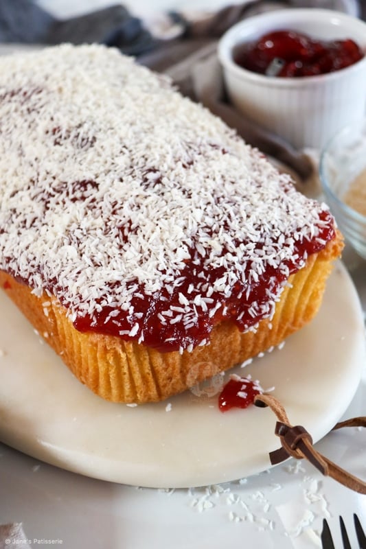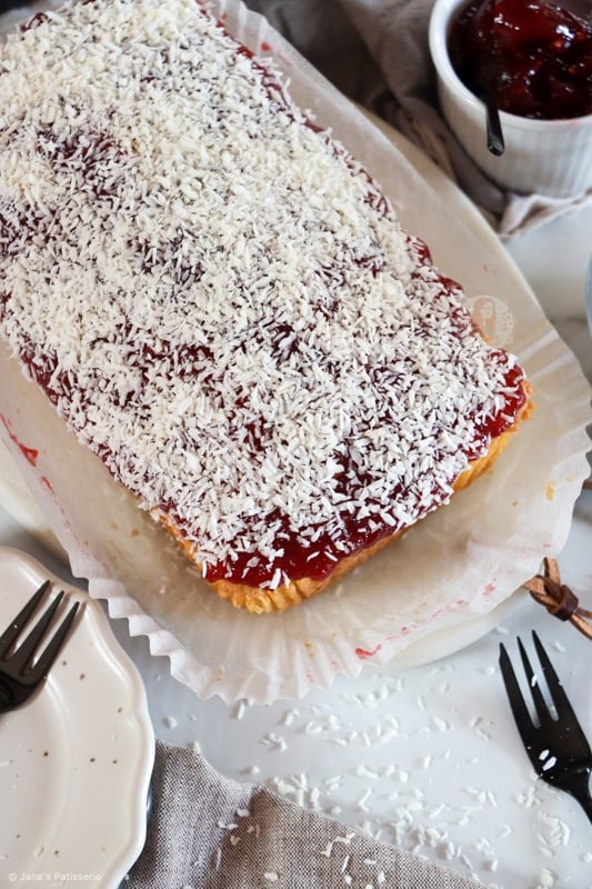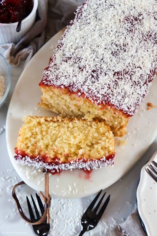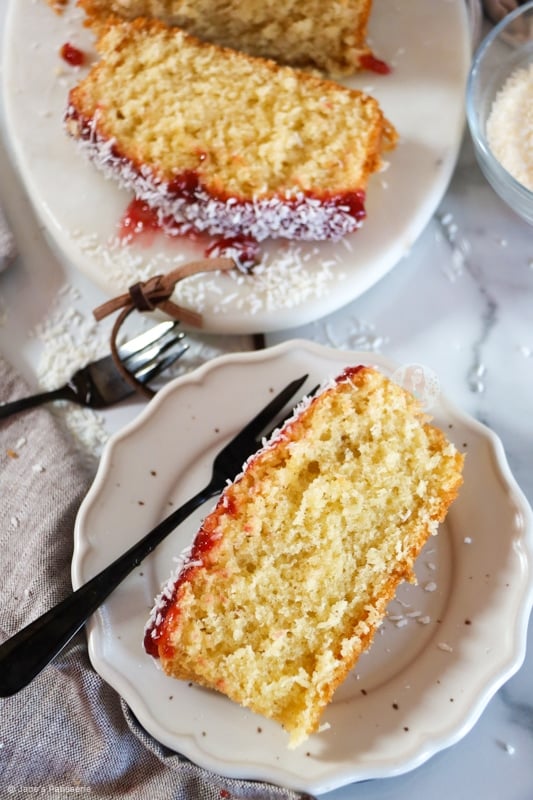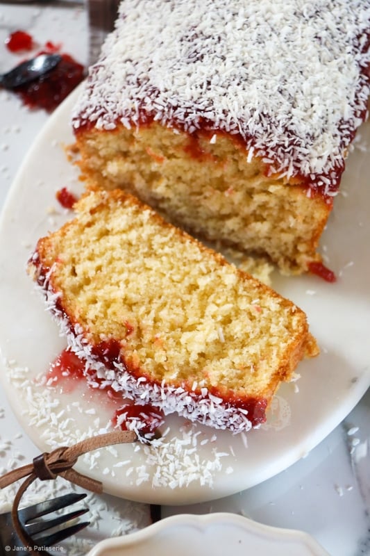 A simple coconut loaf cake sponge topped with raspberry jam and coconut – the best jammy coconut loaf cake!