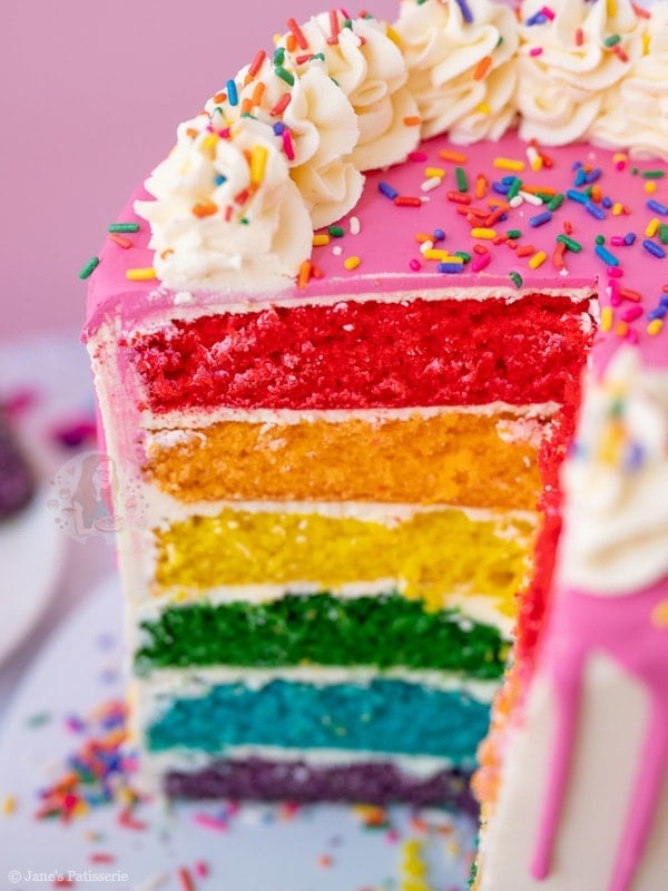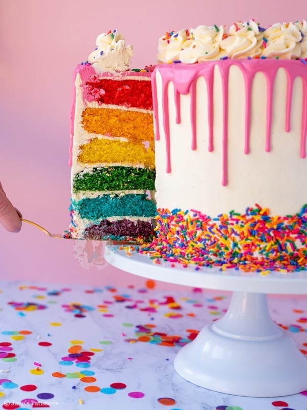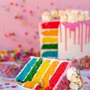 A delicious and bright rainbow cake with vanilla buttercream frosting, a pink drip and sprinkles!
