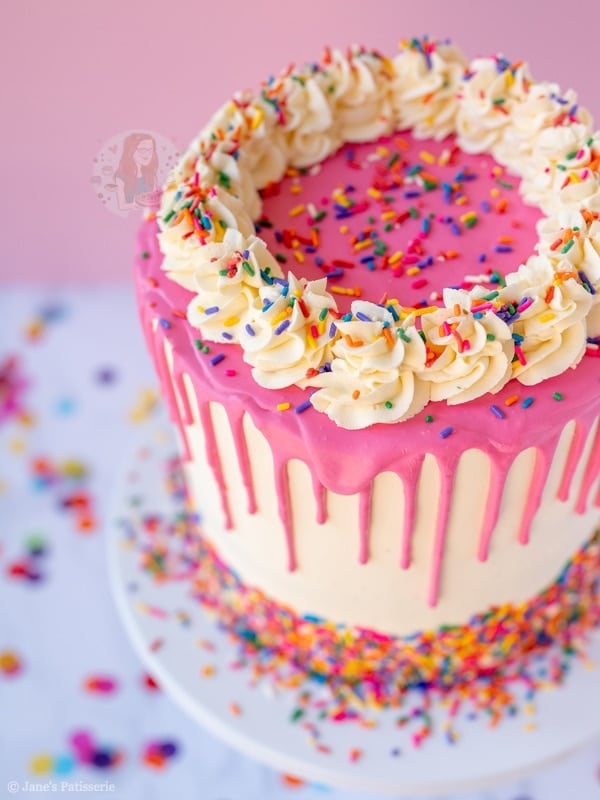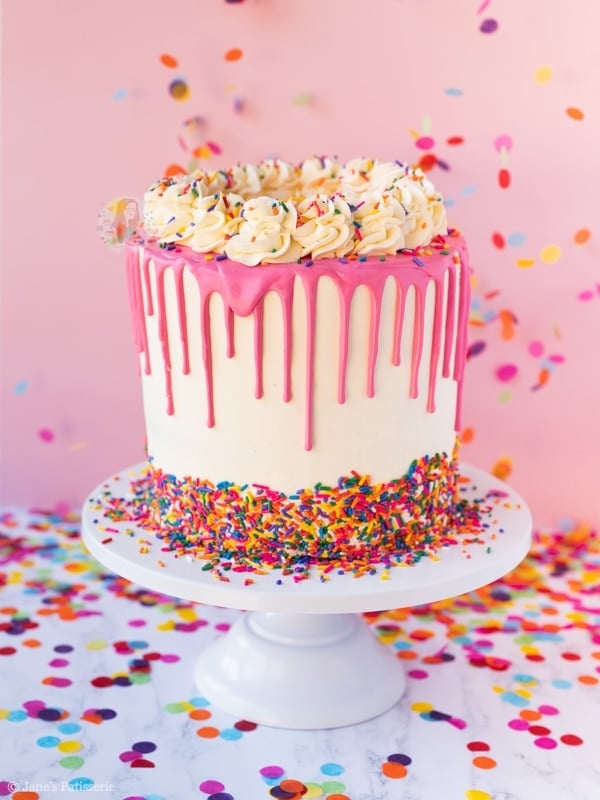 Just as I have finished the buttercream I carefully press in some rainbow sprinkles to the bottom of the cake for a bit of colour and I just love the design – be warned, sprinkles will fall off at this point so beware! After this, I chill the cake again!