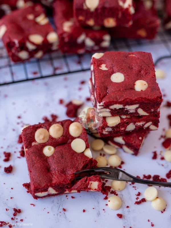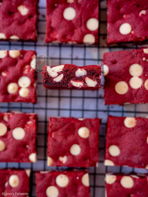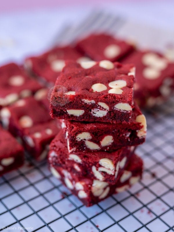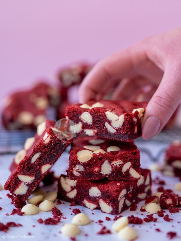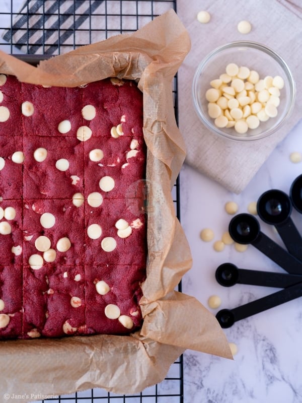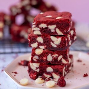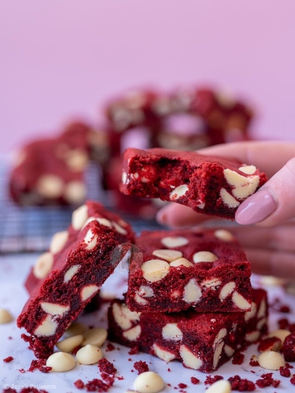 Easy and delicious red velvet cookie bars, stuffed with white chocolate chips! One of the best cookies, in traybake form!