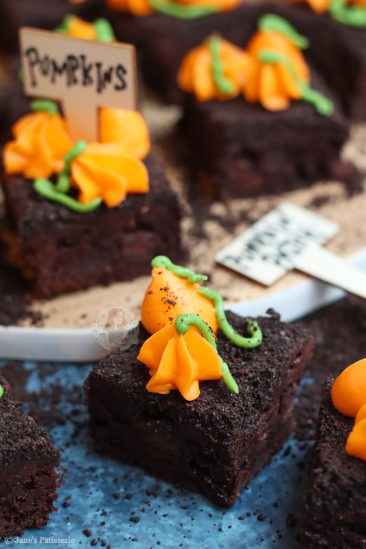 I wanted to do a halloween themed brownie because they are just fun to do – and couldn’t work out whether to do a graveyard brownie, or creepy sweets making something spooky, but a pumpkin patch brownie?! Even better!