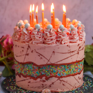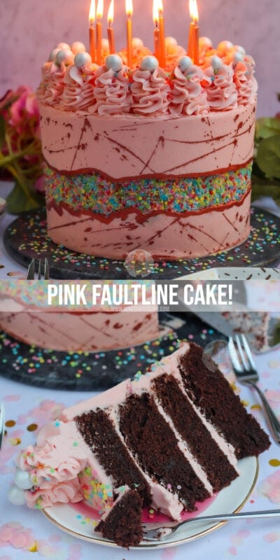 Don’t worry if you cover some of the sprinkles, or if it looks a little rugged – this is good! It creates the jagged edge that is perfect for a fault line cake. Once the buttercream has been smoothed around the edges and top of the cake, I chill it again.
