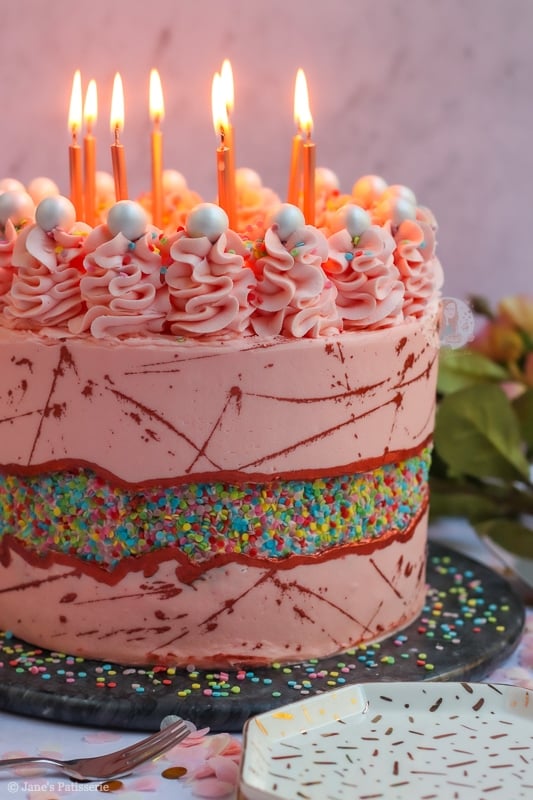 When doing the ‘fault line’ part – it can get a little messy if you use sprinkles like I did! I spread a little of the buttercream around the middle section of the cake using a small angled spatula, and pressed some sprinkles carefully into this buttercream. You don’t need much buttercream, just enough to use as ‘glue’.