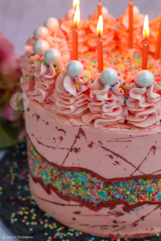 I used the leftover buttercream to pipe tall swirls of buttercream on the top – and sprinkle on more of the sprinkles, and some large pearl sprinkles for an extra touch! This is of course, optional.