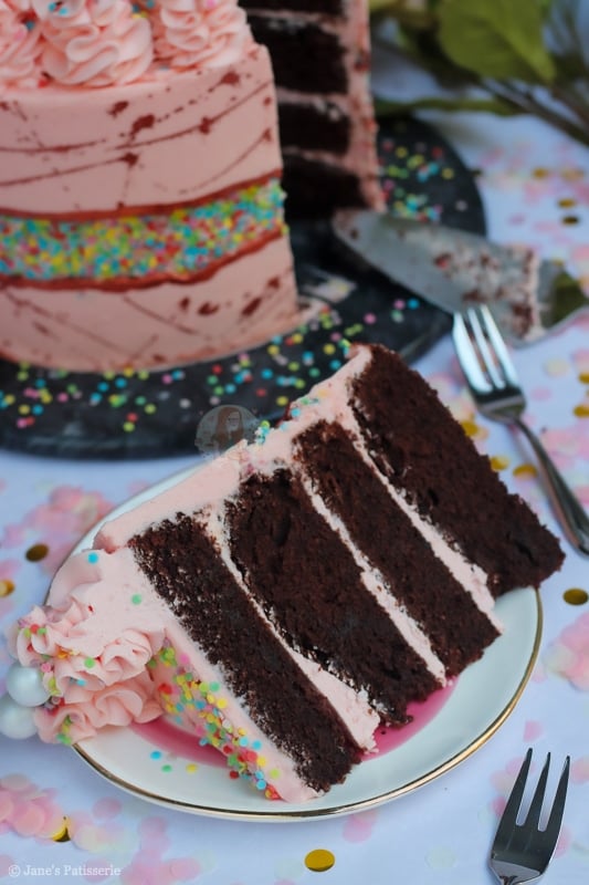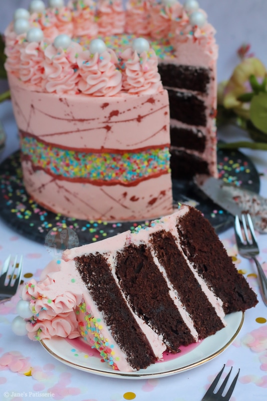 I used a four layer cake – baking into two of these cake tins. A slightly lower baking time means it bakes flat, and it stays moist! It’s the charm of baking a slightly deeper cake too. Although, don’t take them out too early, as the cakes will really sink if you do!
