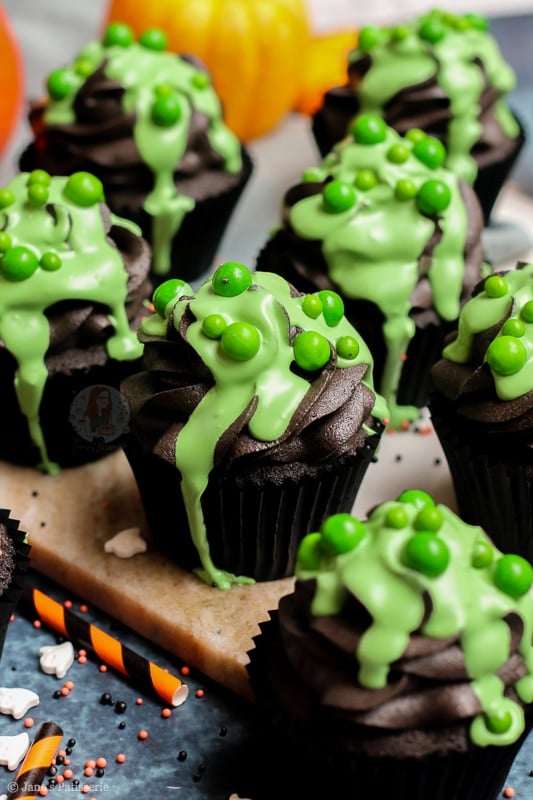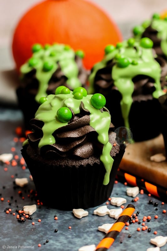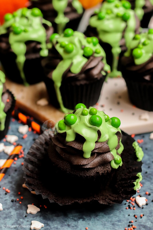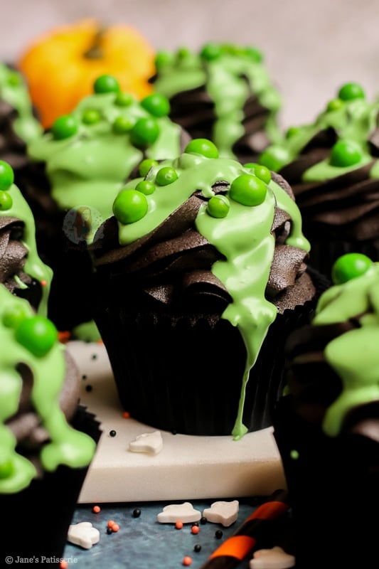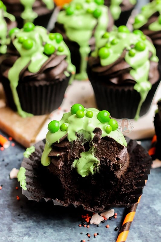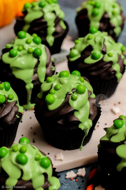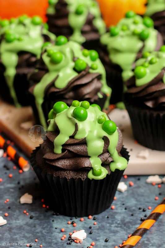 Baking these into these beautiful black cases makes something heavenly delicious – but also a little weird looking. It is black cake after all! However, using the buttercream frosting and the green slime ganache contrasts so much better against the black colour.