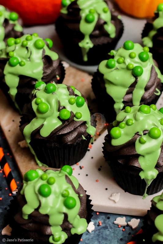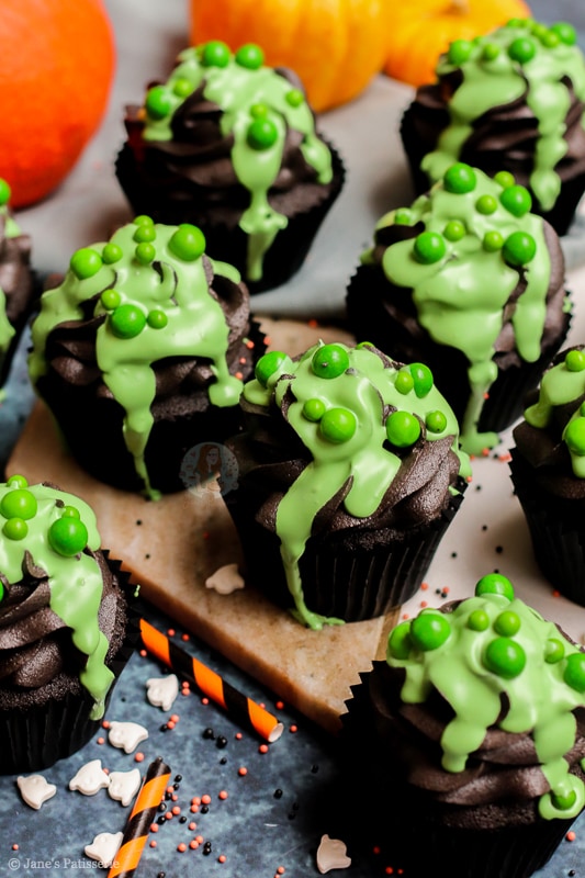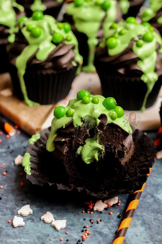 Delicious scaretastic slime cupcakes with a black chocolate sponge, chocolate black buttercream frosting, and a gooey white chocolate slime drizzle and centre!