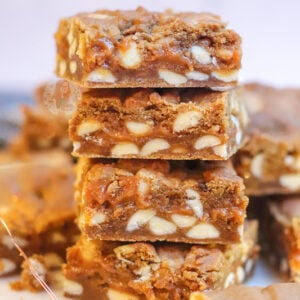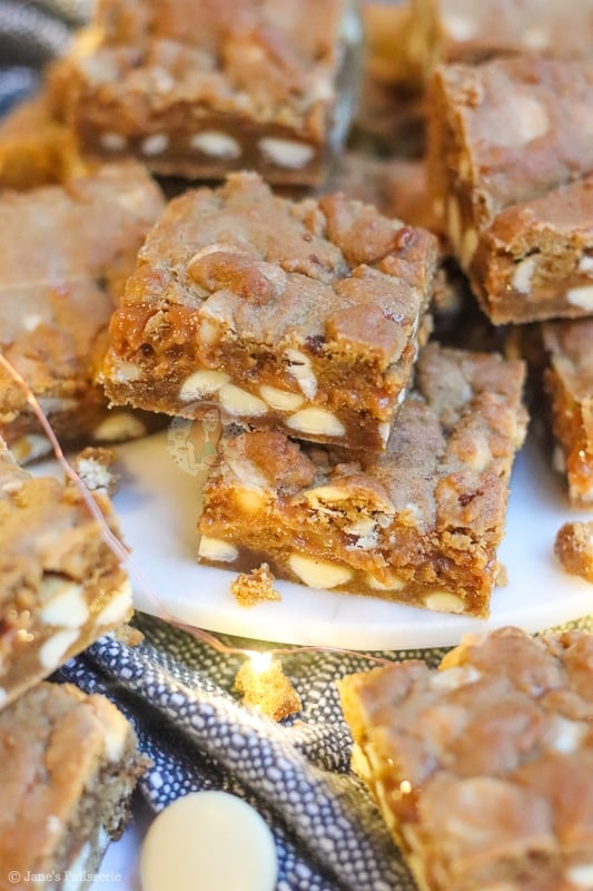 One of the other most popular cookies I have done is my gingerbread NYC cookies, and I have had SO MANY REQUESTS since last year to make a cookie bar version… so here it is… but with a delicious caramel twist – caramel gingerbread cookie bars!