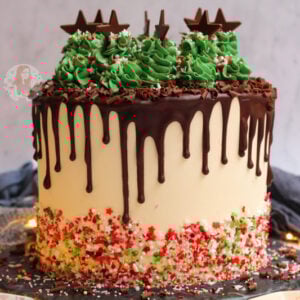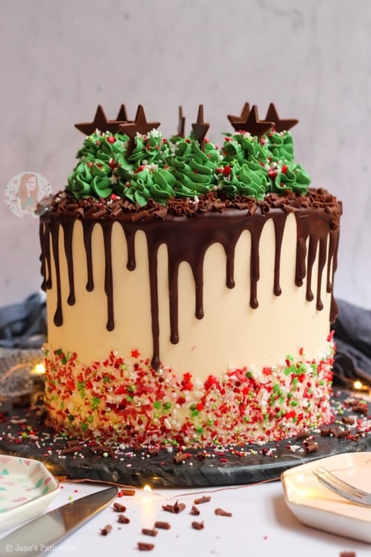 I decided to press some really cute Christmas sprinkles into the base of the cake as I wanted to go over the top as I mentioned at the beginning of this blog post – but you can use other sprinkles, chocolate curls, or leave it plain! I really just was going for the showstopper element.