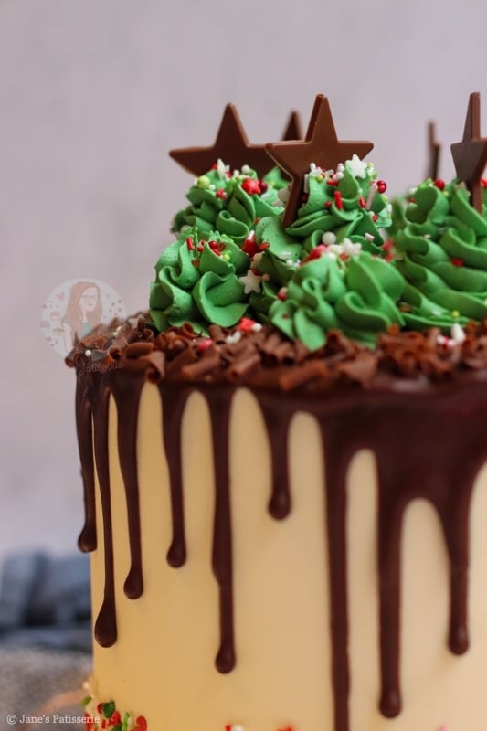 The frosting is an american buttercream frosting – as it is just so easy and perfect for a bake like this Christmas drip cake! I wanted something to fill the cake, crumb coat the cake, and then cover and decorate with! So a decently sized batch of buttercream is the way to go.